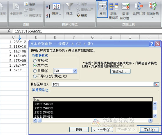 2.用Excel选择一列数字,选择数据→分列→下一步→下一步→选择文本→完成。如下图: