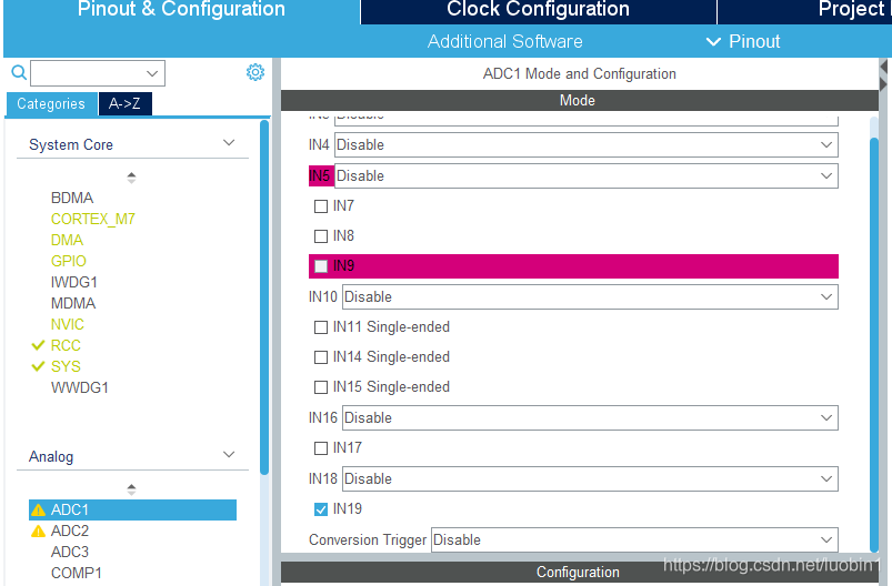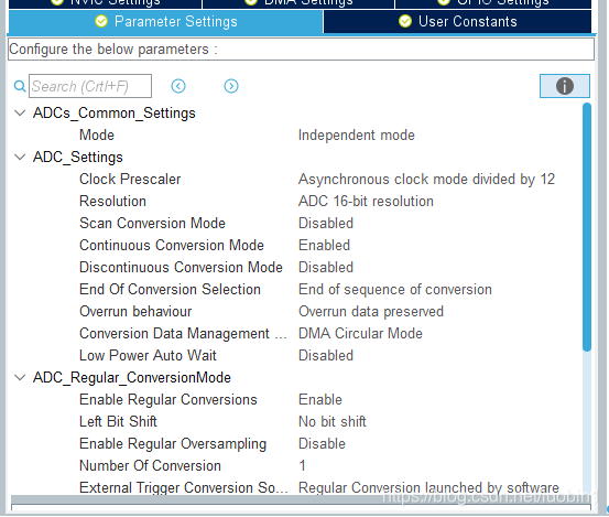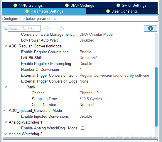 参考官方例程之后按照如下方法配置ADC DMA,发现DMA目标数组无值,后发现为DMA目标数组定义需要避开DTCM区域。下图为cubeMX配置方法