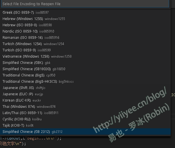 VS code可以自由的使用各种编码格式存储文件,选择右下角标题栏上的“Select Encoding”,会弹出如下的“Reopen with Encoding”和“Save with Encoding”两个选项,选择第一个,则弹出如下菜单: