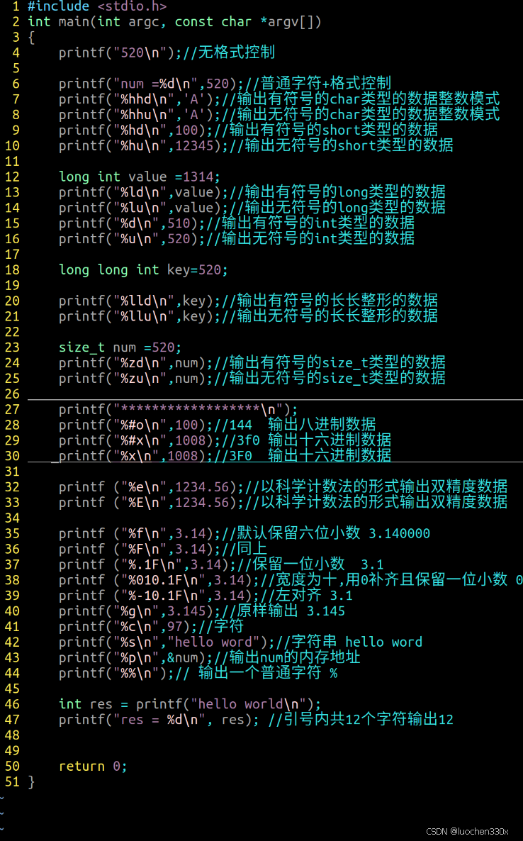 参数2:... 表示可变参数,后面这些参数,根据第一个字符串中的格式控制符的个数而定,并且与之一一对应,多个参数中间使用逗号隔开 返回值:函数执行成功,返回成功输出的字节的个数,失败返回一个负数