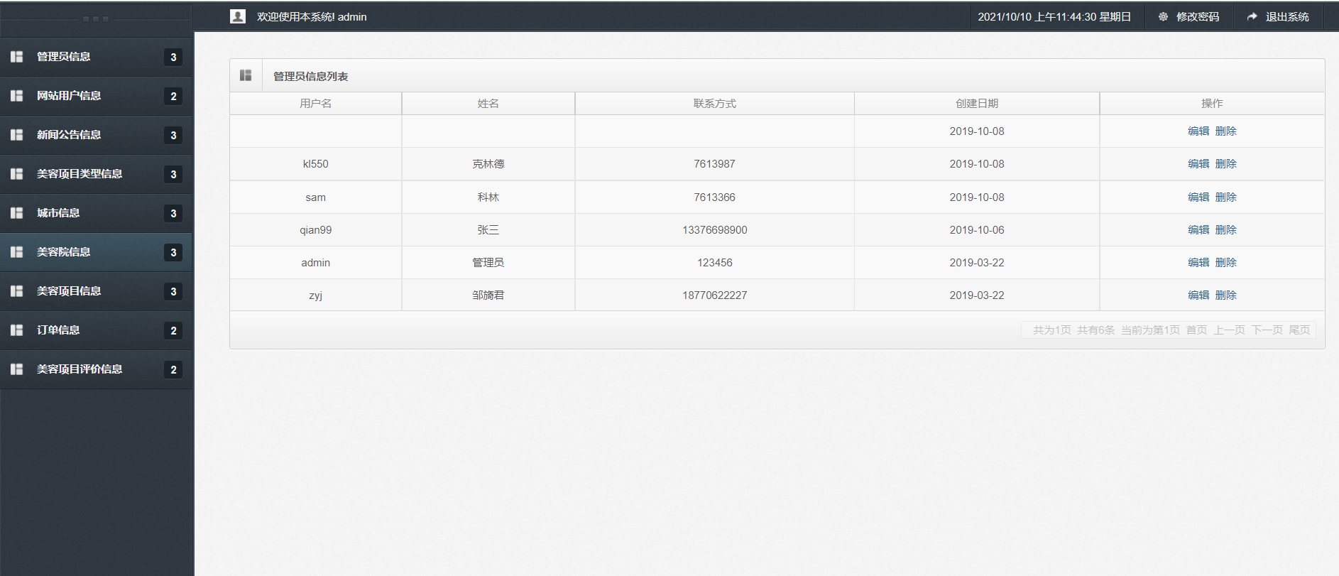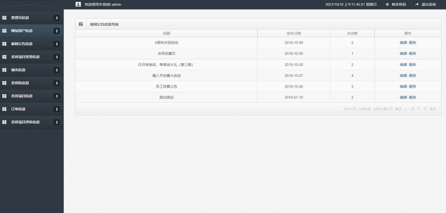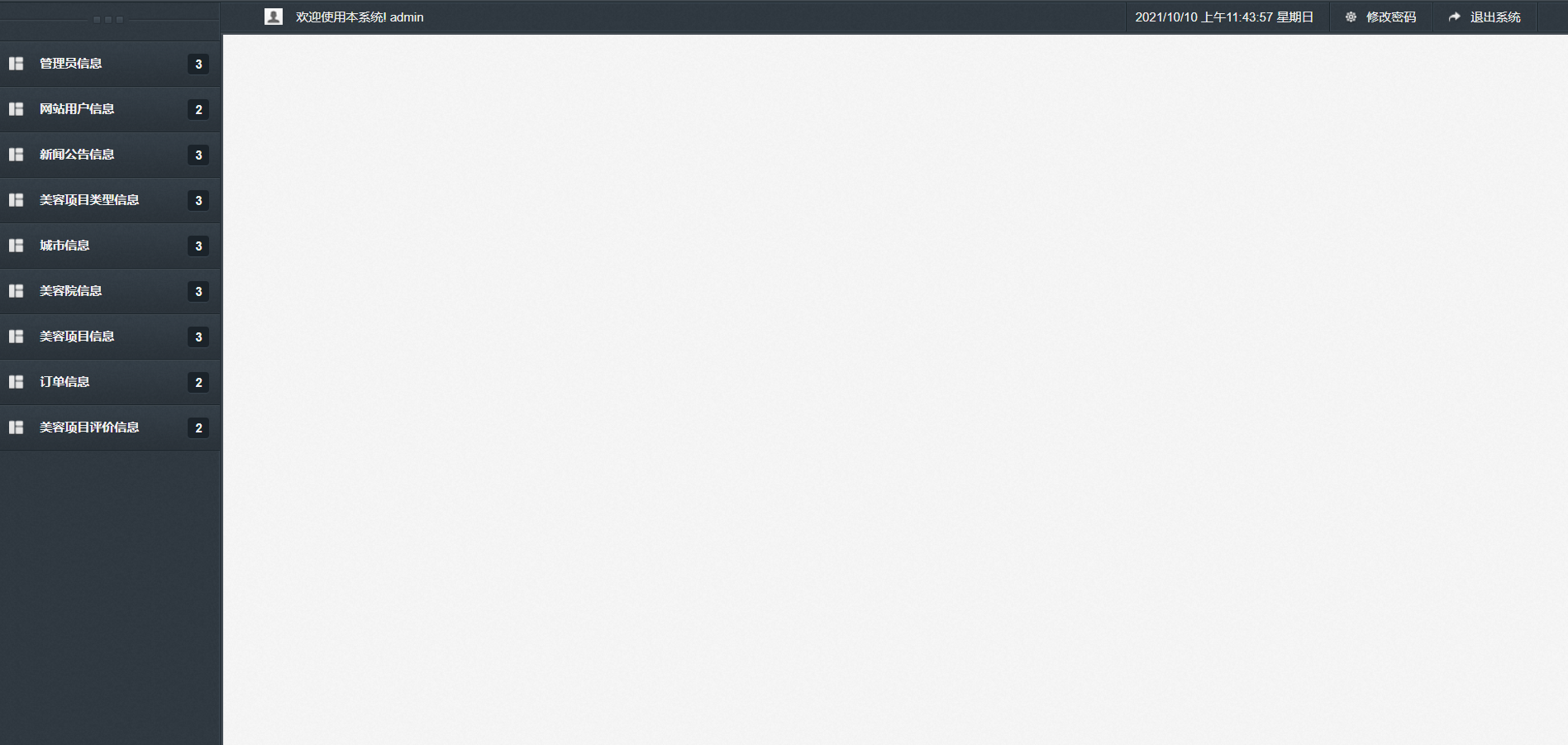主要功能说明: 管理员角色包含以下功能:登录,首页,新增管理员,管理员信息列表,网站用户信息列表,新增新闻公告信息,新闻公告信息查询,美容项目类型信息查询,城市列表,