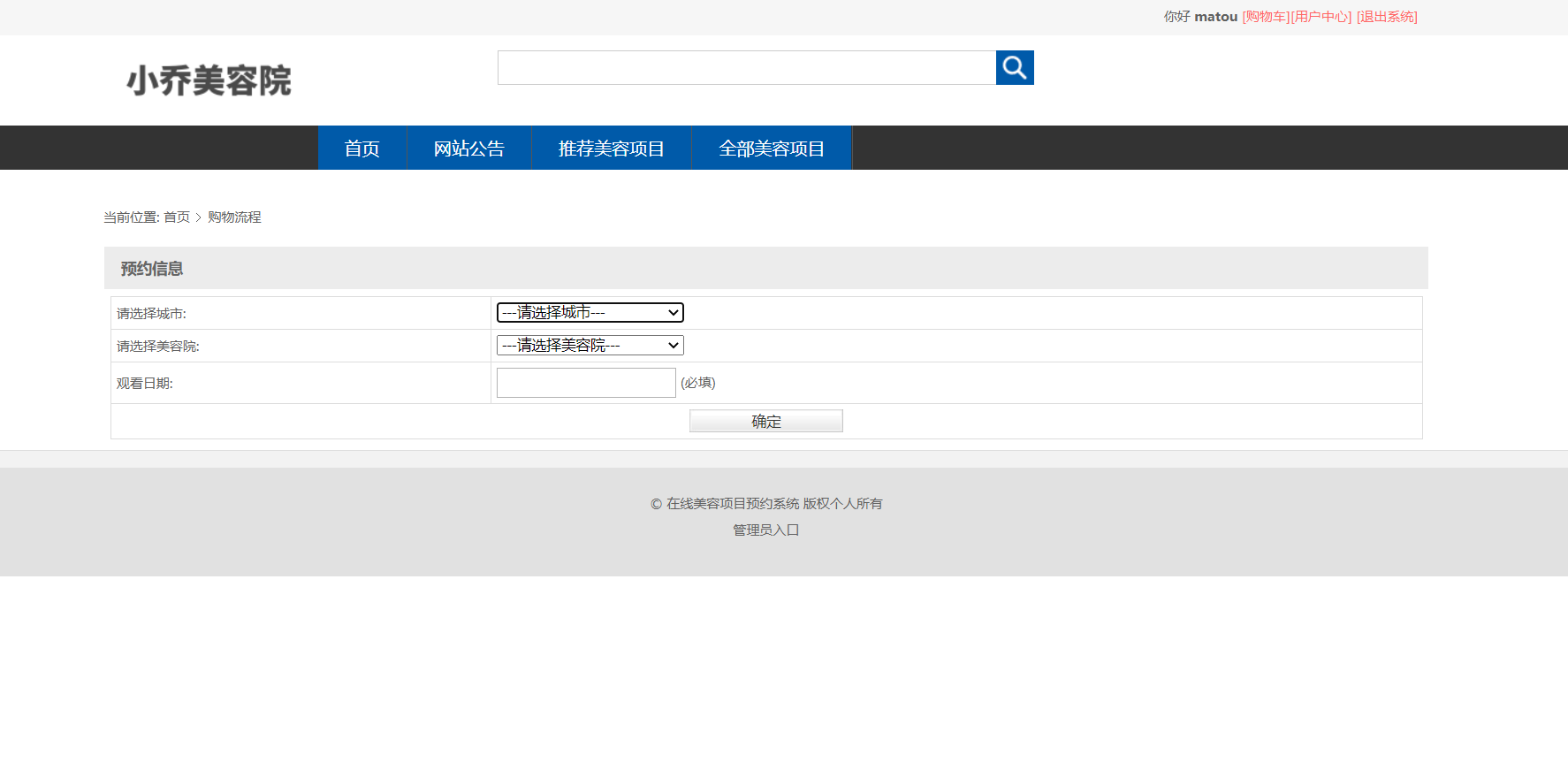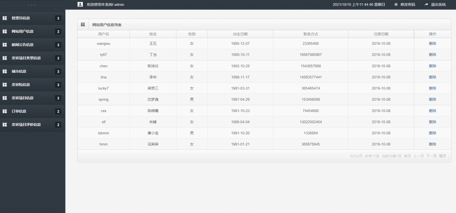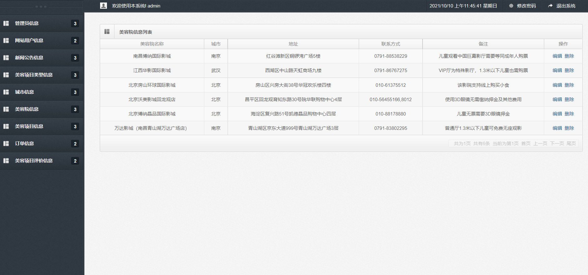 主要功能说明: 管理员角色包含以下功能:登录,首页,新增管理员,管理员信息列表,网站用户信息列表,新增新闻公告信息,新闻公告信息查询,美容项目类型信息查询,城市列表,