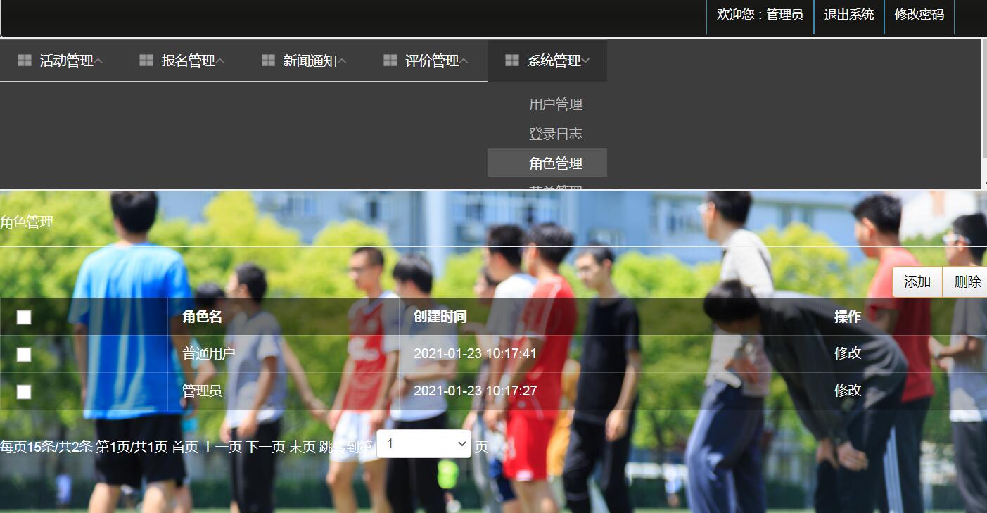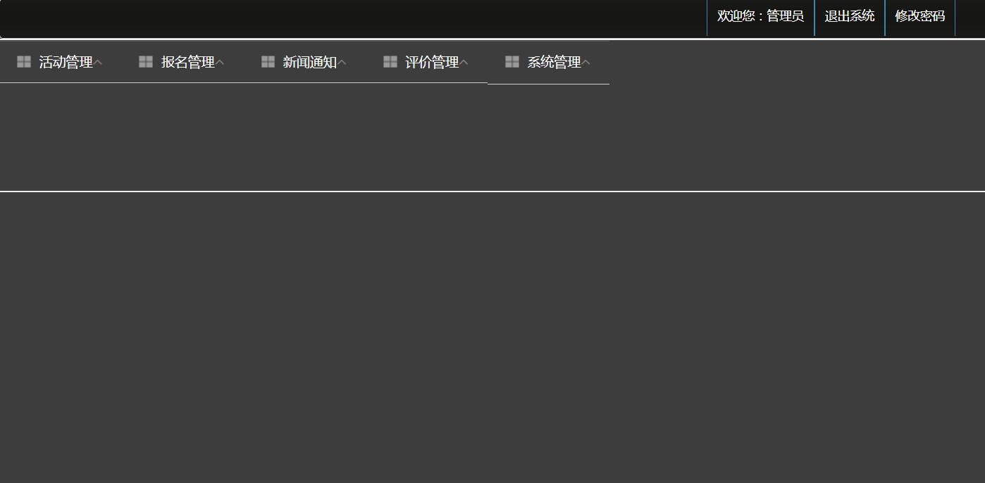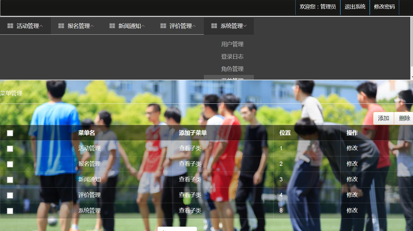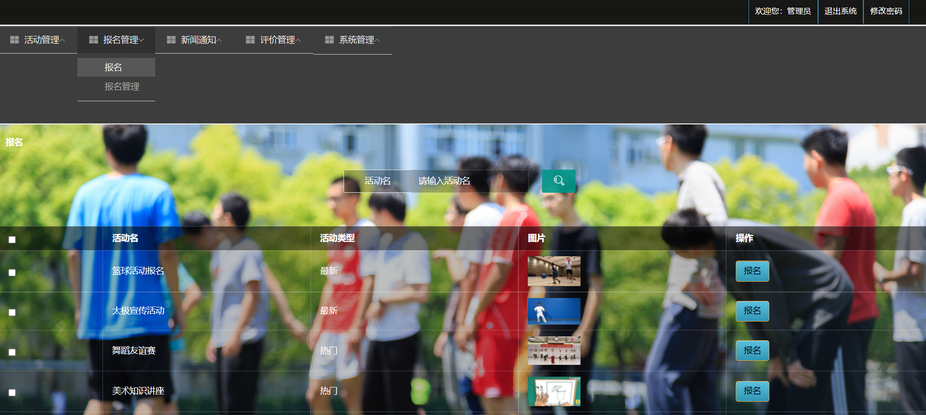 后台管理:登录、注册、活动的增删改查、类型的增删改查、报名信息的查看删除、新闻的增删改查、新闻分类的增删改查、 评论的增删改查、 用户的添加删除修改、角色的添加删除修改、菜单的添加删除修改。