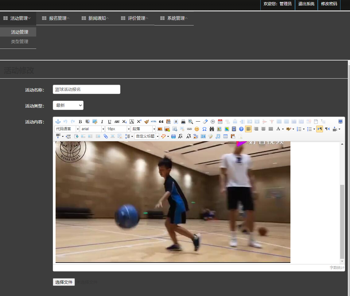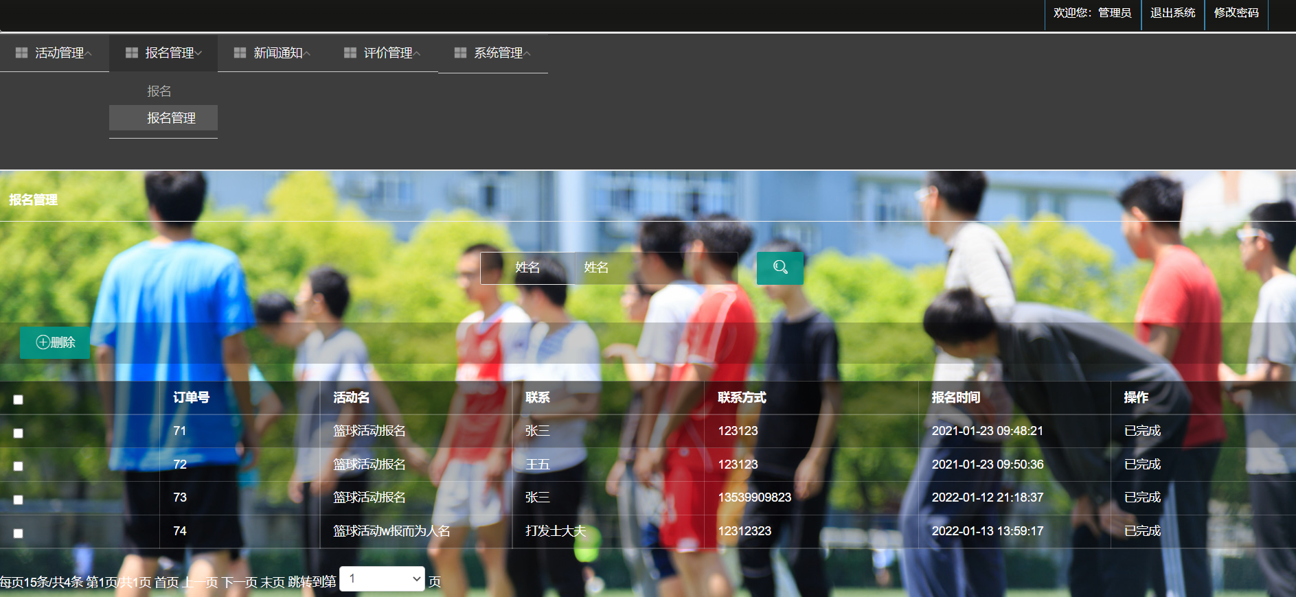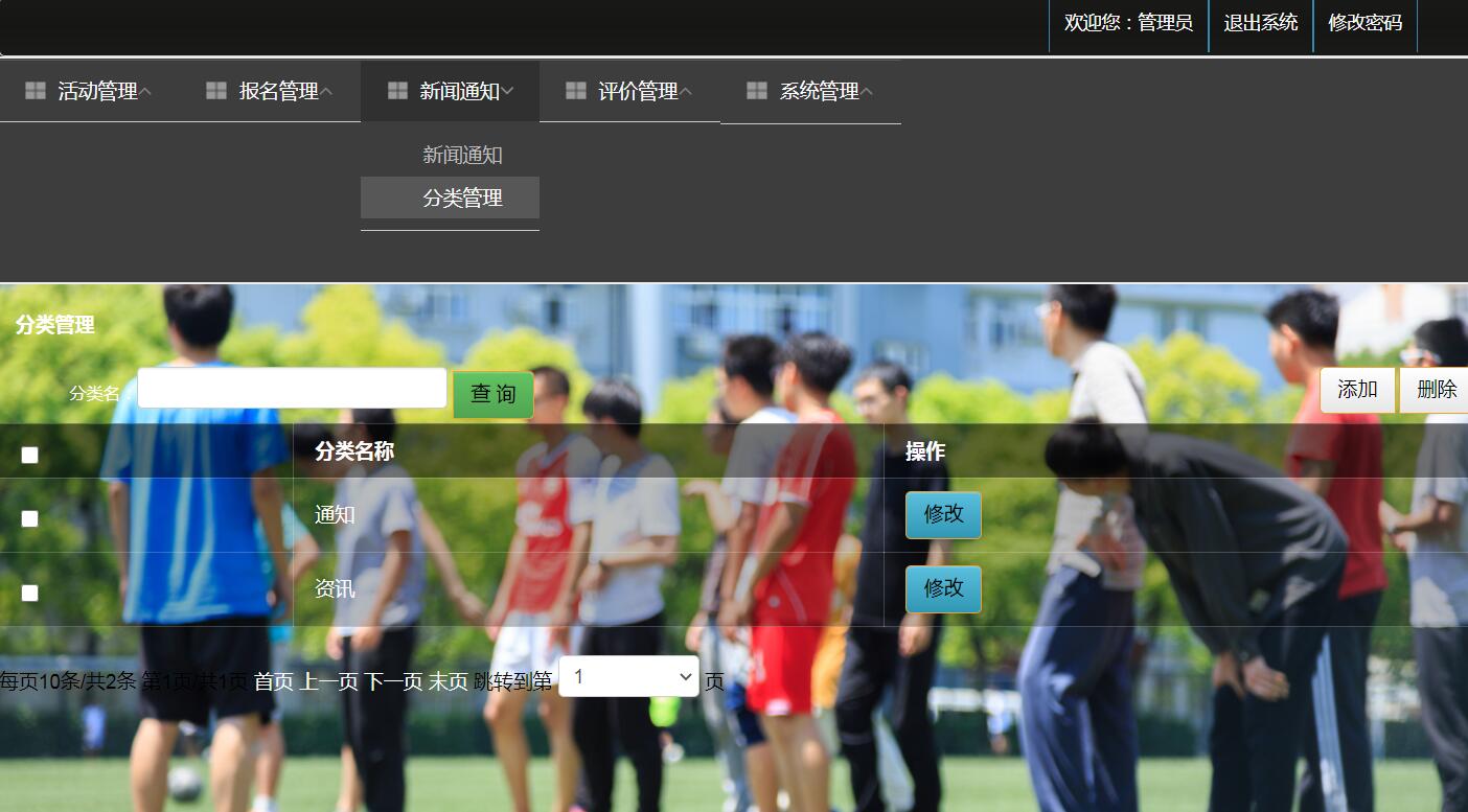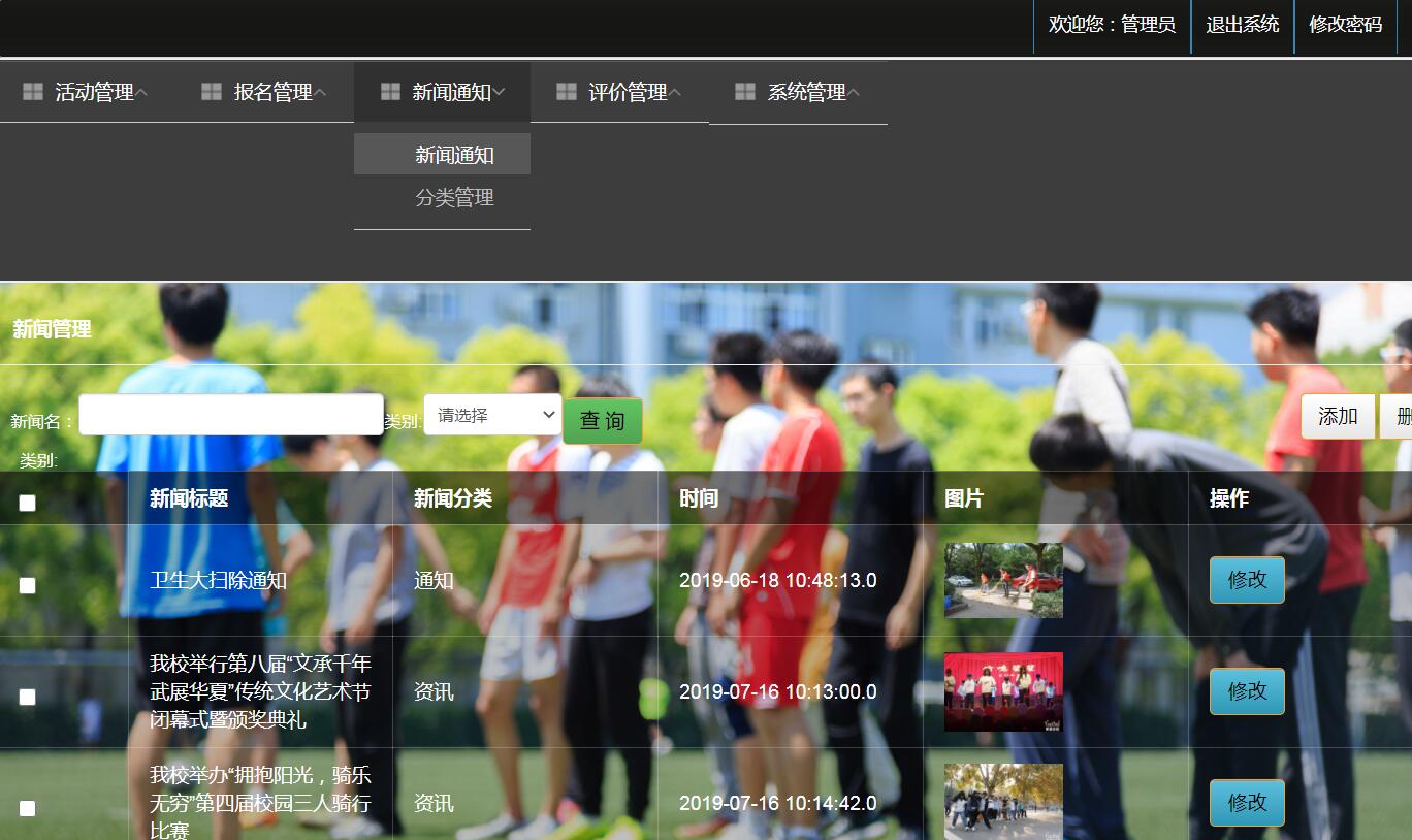 后台管理:登录、注册、活动的增删改查、类型的增删改查、报名信息的查看删除、新闻的增删改查、新闻分类的增删改查、 评论的增删改查、 用户的添加删除修改、角色的添加删除修改、菜单的添加删除修改。