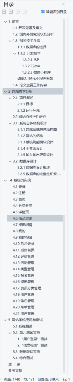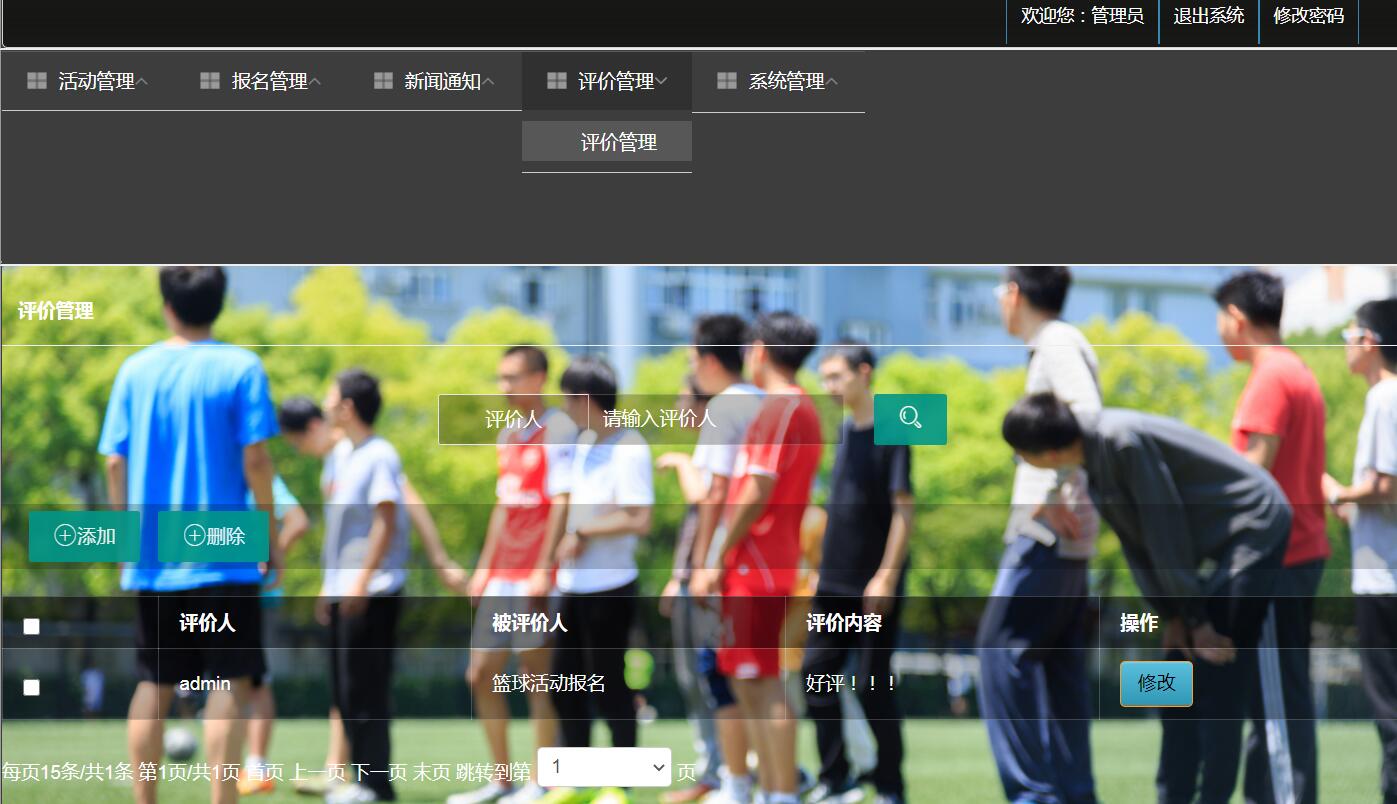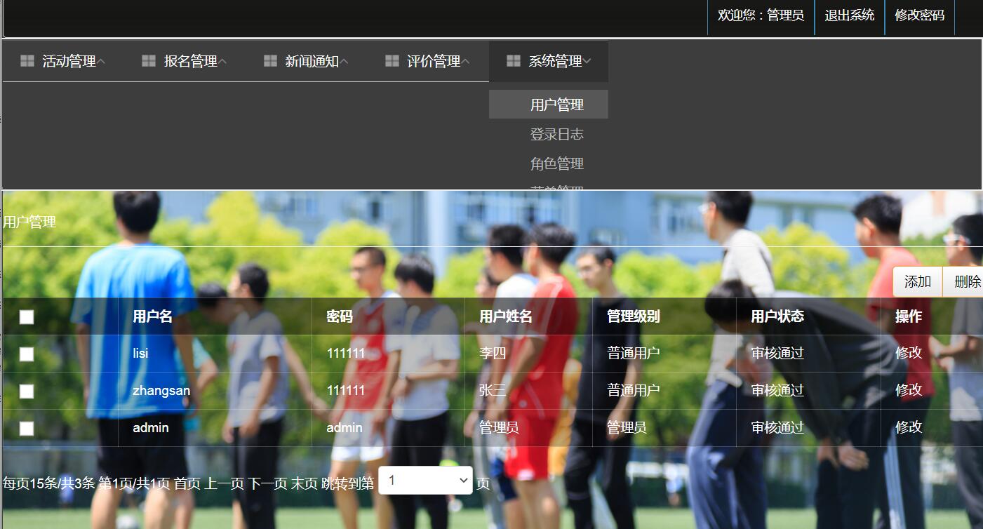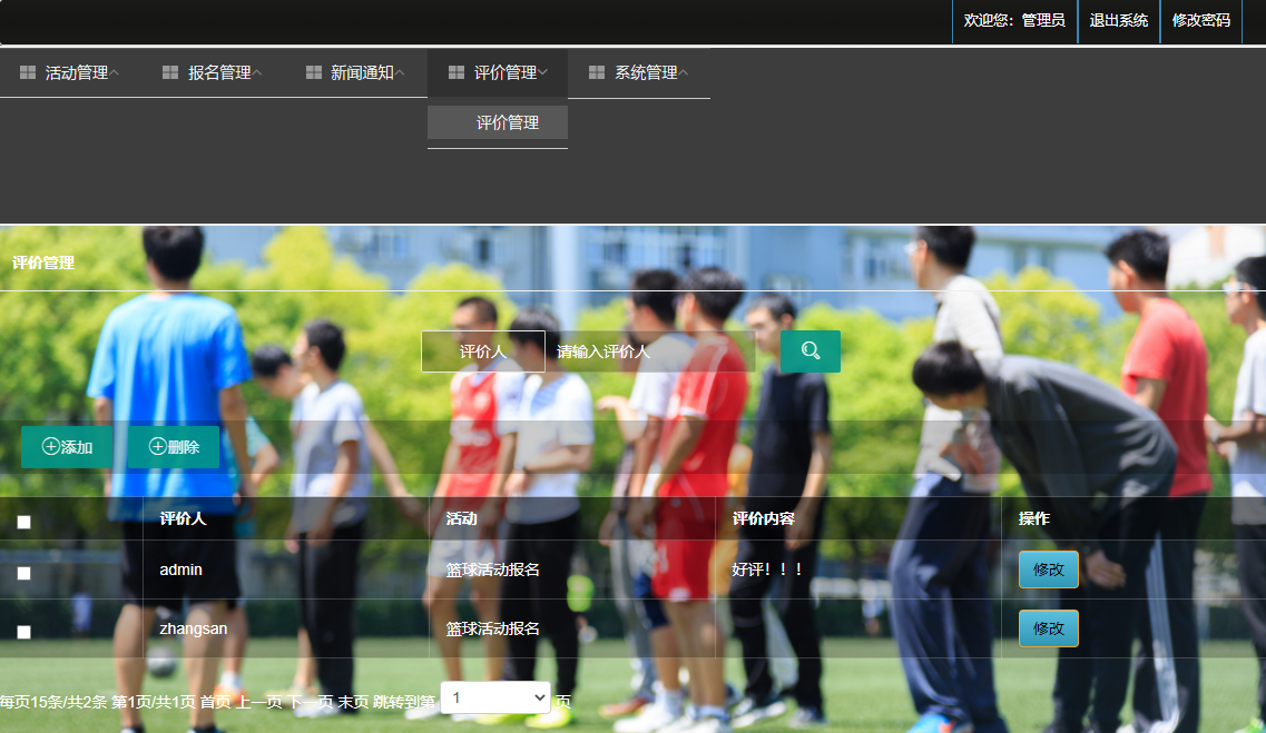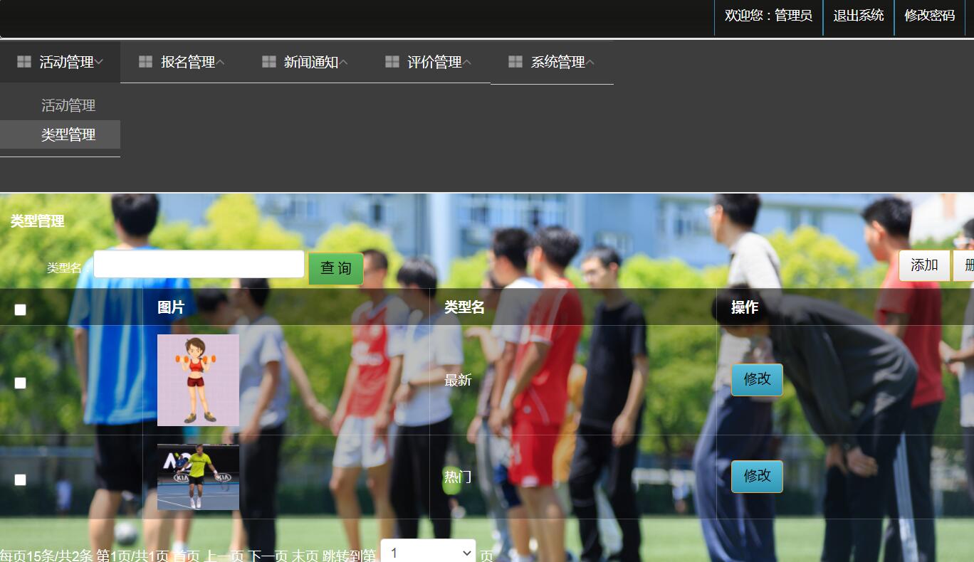 后台管理:登录、注册、活动的增删改查、类型的增删改查、报名信息的查看删除、新闻的增删改查、新闻分类的增删改查、 评论的增删改查、 用户的添加删除修改、角色的添加删除修改、菜单的添加删除修改。