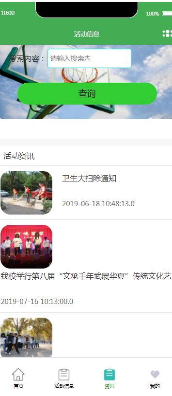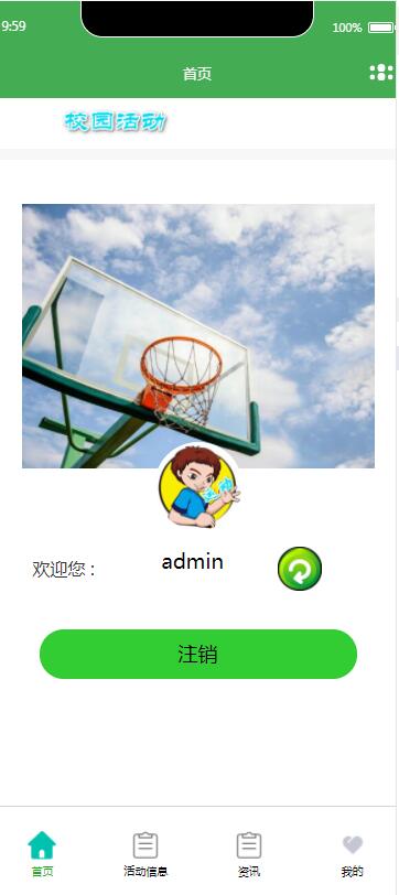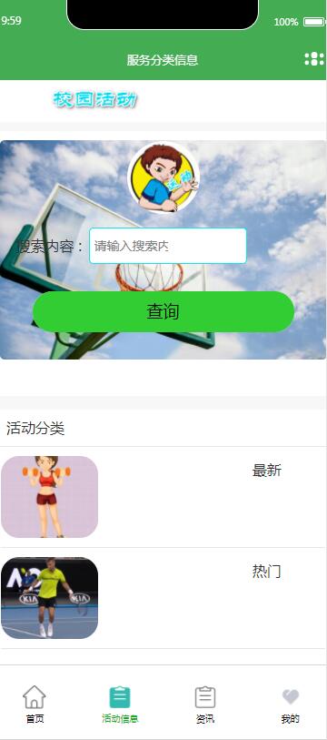 前台功能介绍:查看并搜索所有的校园活动,查看活动详情并预约、查看活动资讯、查看我的报名信息,评价活动、登录、注册