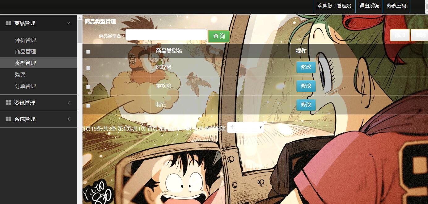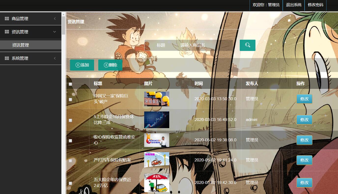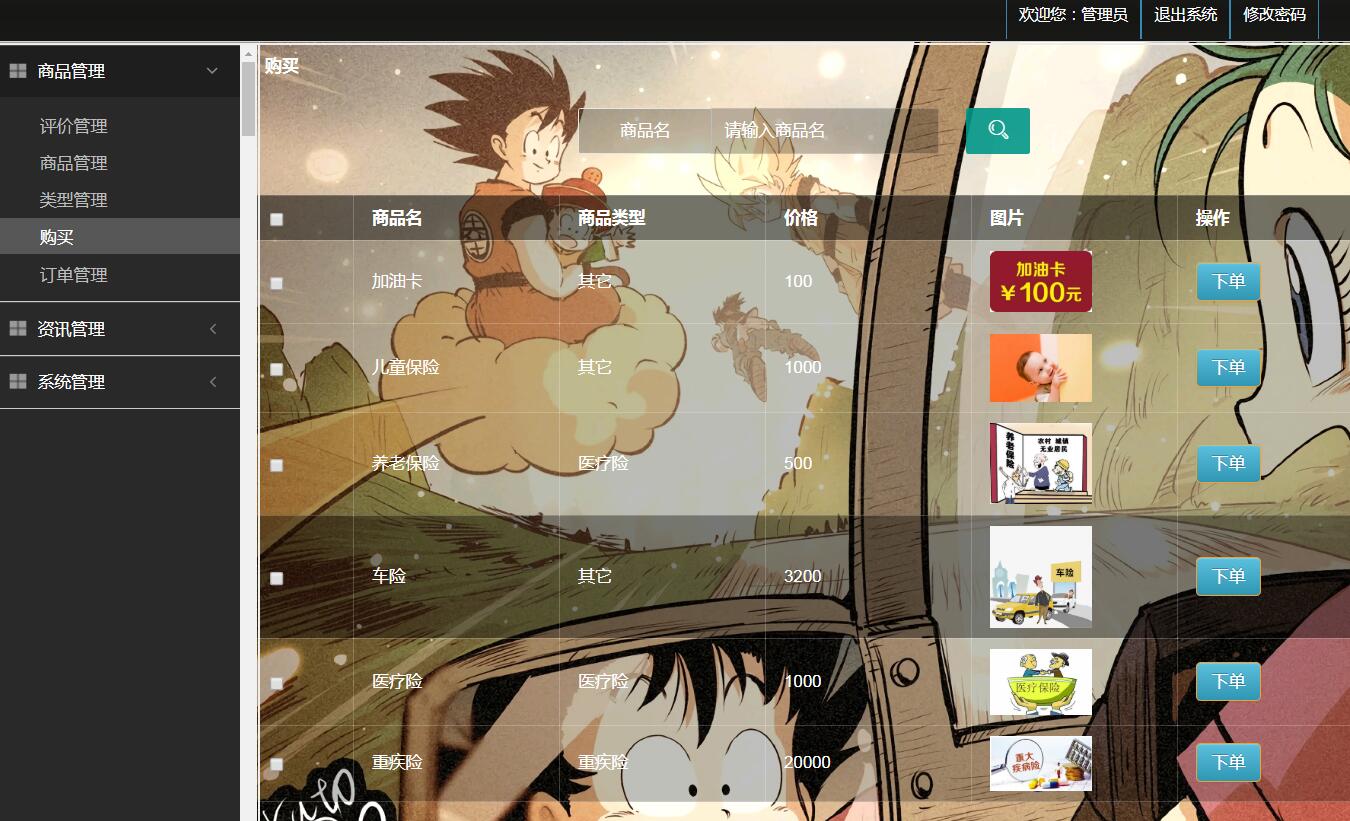 后台管理:登录、注册、商品的增删改查、类型的增删改查、后台购买保险、订单的查询删除、资讯的增删改查 用户的添加删除修改、角色的添加删除修改、菜单的添加删除修改。