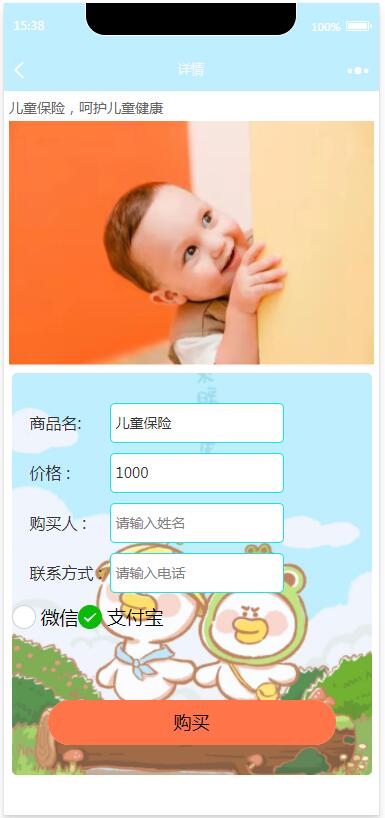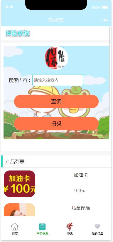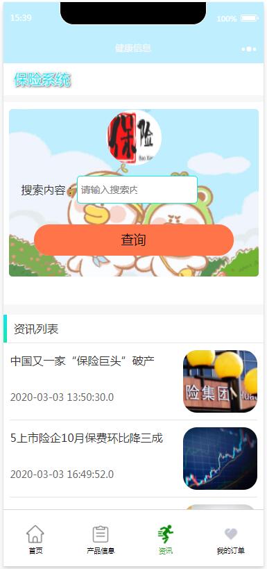 前台功能介绍:查看并搜索所有的保险信息,购买保险、查看资讯、查看我的订单、登录、注册