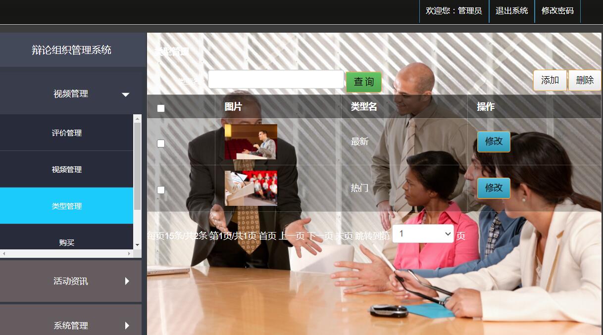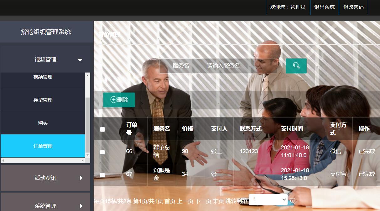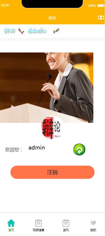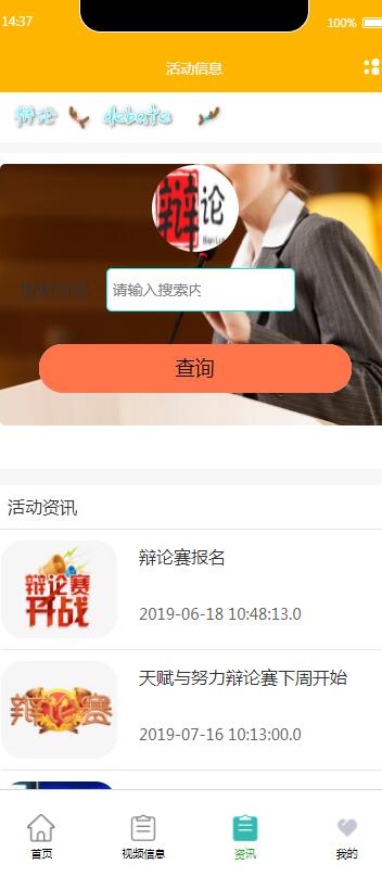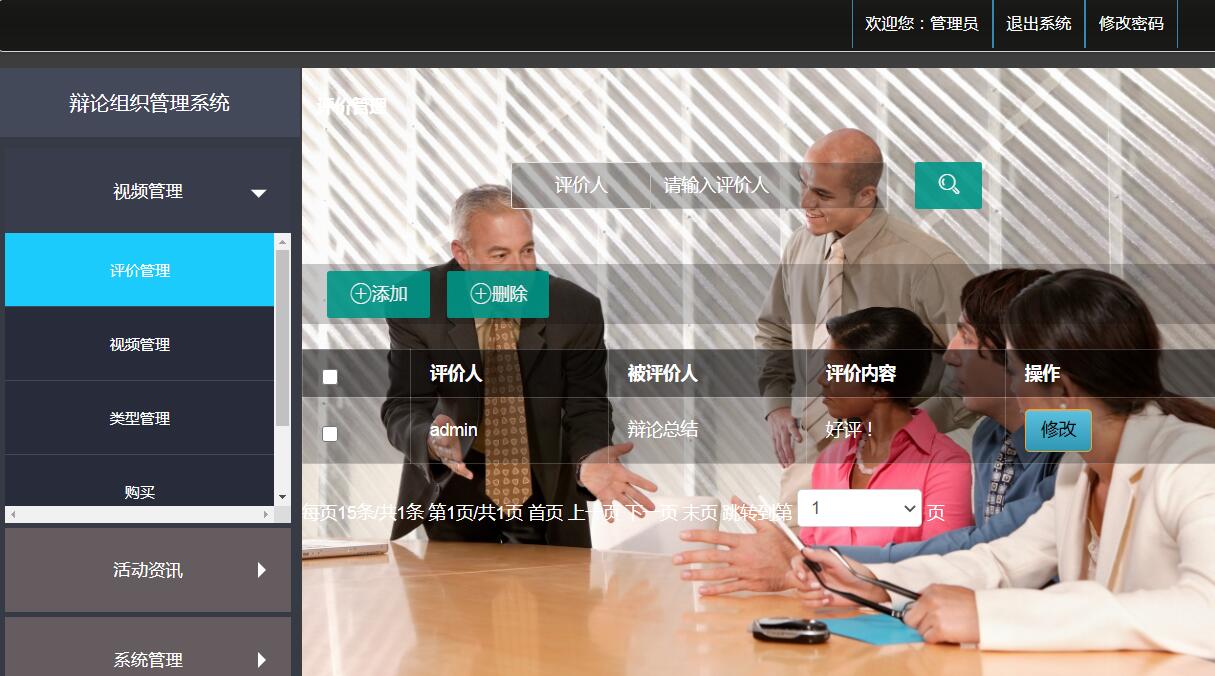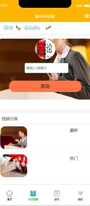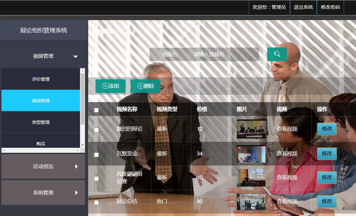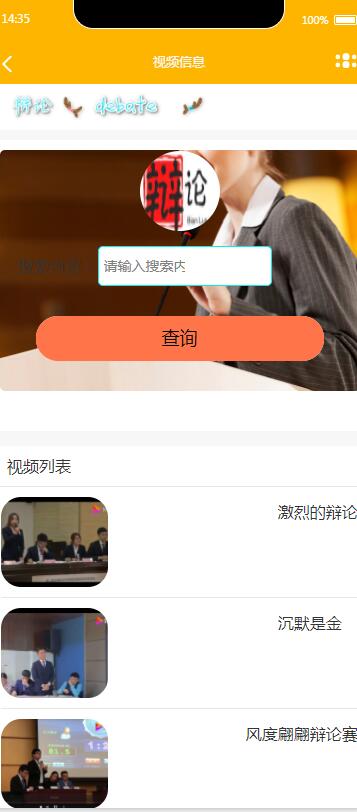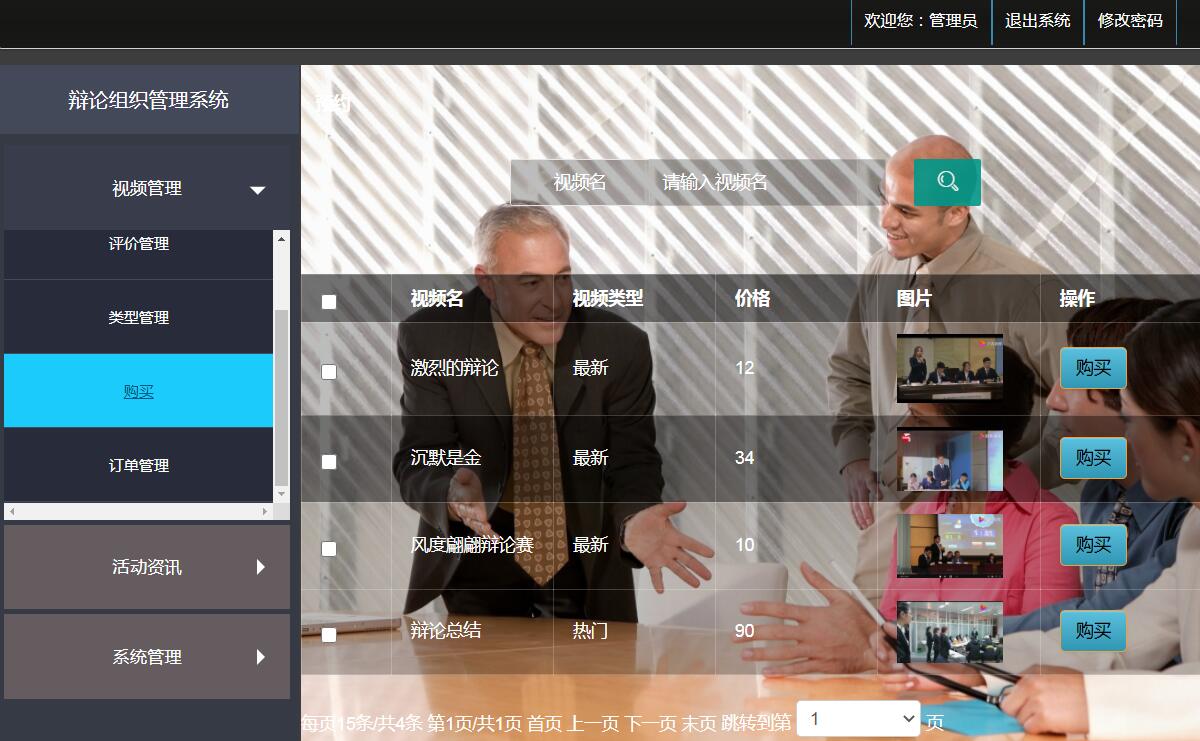 前台功能介绍:查看并搜索所有的辩论视频,购买视频、评价、查看活动资讯、登录