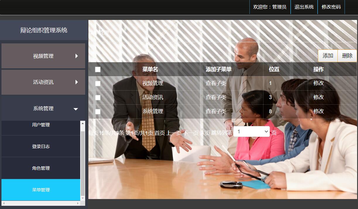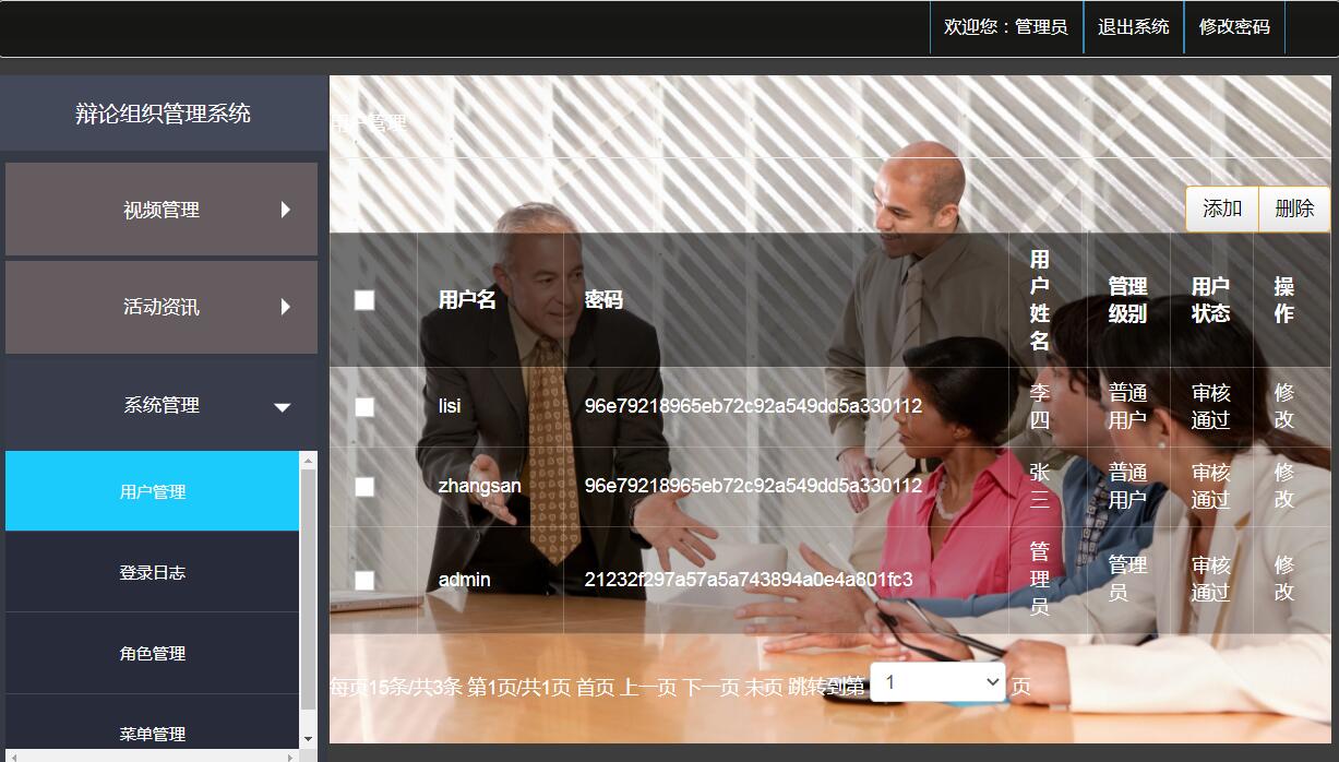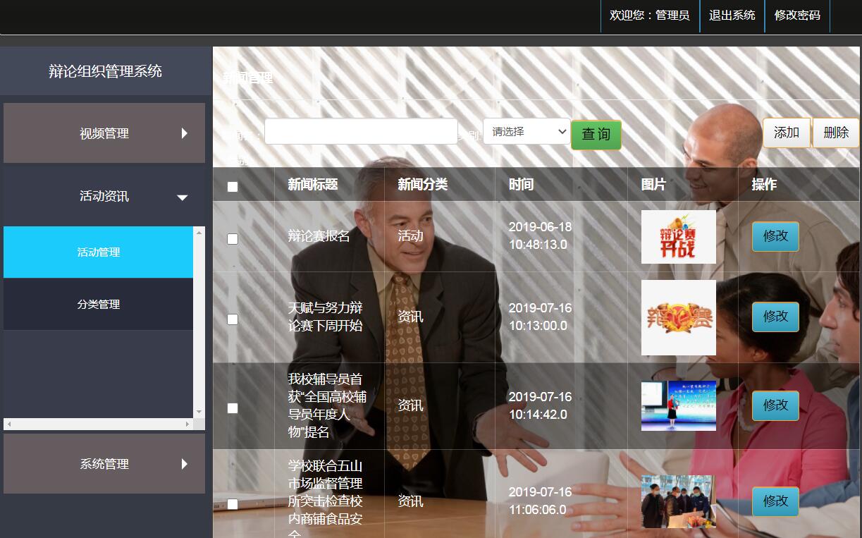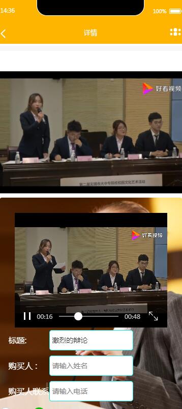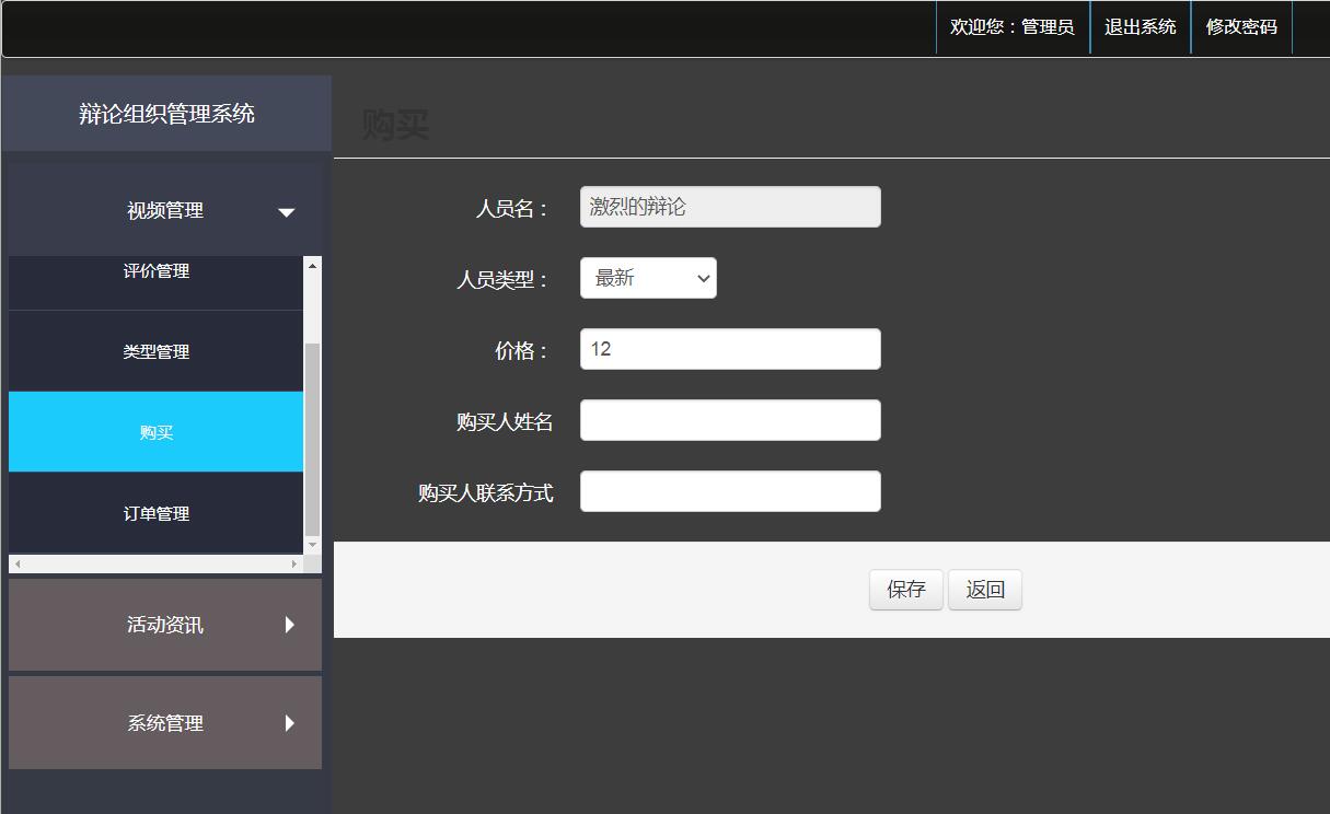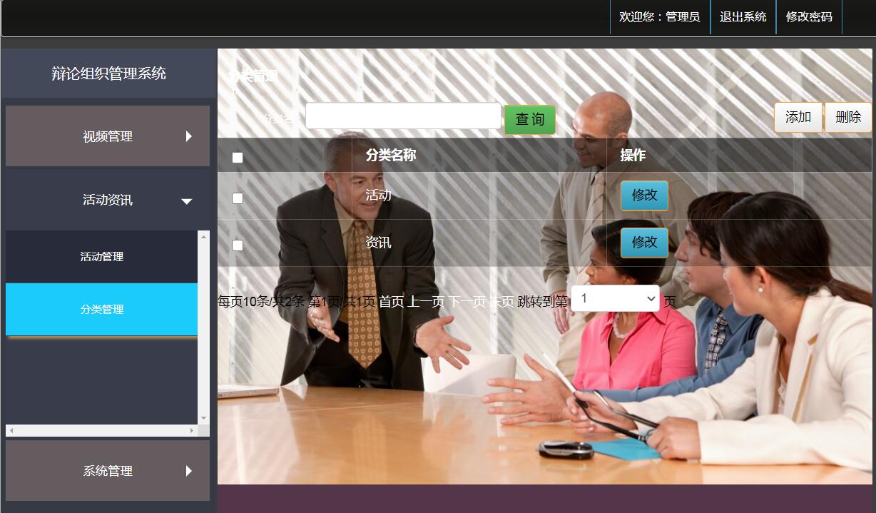 前台功能介绍:查看并搜索所有的辩论视频,购买视频、评价、查看活动资讯、登录