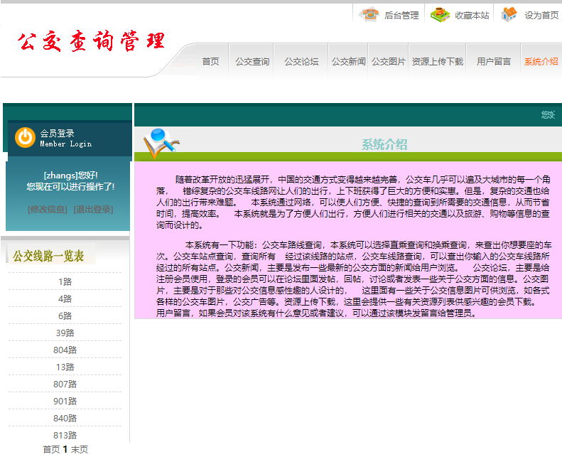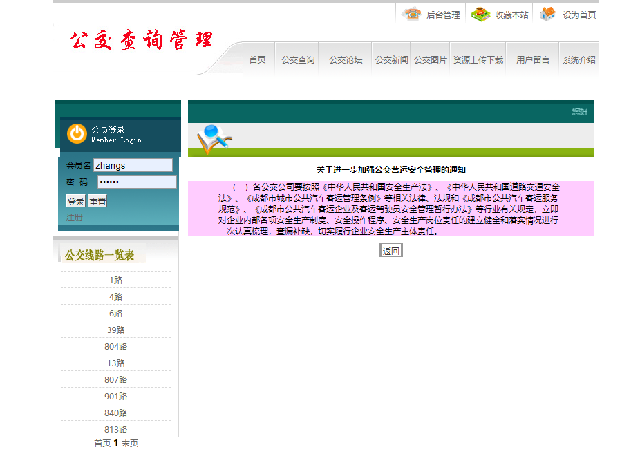 用户:可以注册、登录网上公交系统,首页具有公交线路一览、公交新闻等;用户可以按条件搜索公交线路,可以查看公交线路详情;可以查看公交论坛,可以创建话题,可以参与话题互动回复;可以查看所有公交新闻,查看新闻详情;可以查看所有公交图片;可以查看所有资源和上传以及下载资源;可以进行用户留言;查看系统介绍等功能。