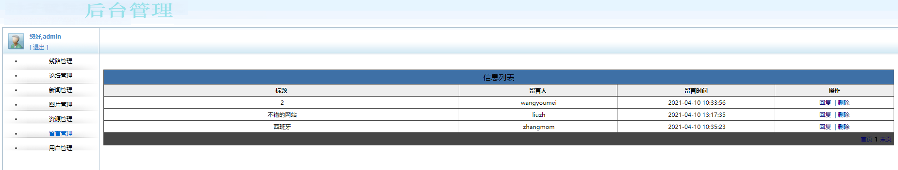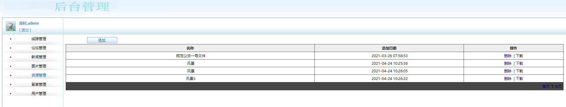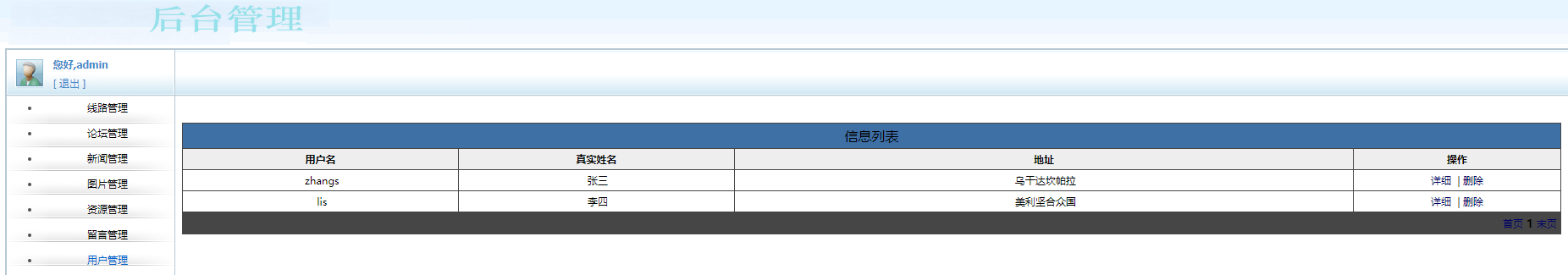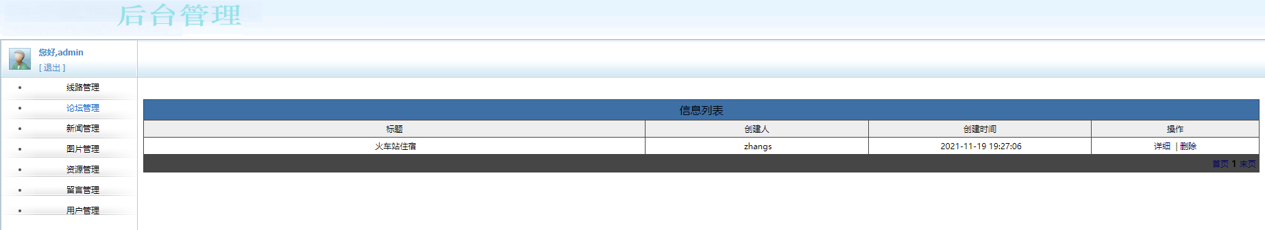 管理员用户:可以进行线路管理、论坛管理、新闻管理、图片管理、资源管理、留言管理、用户管理等功能。 系统功能完整,另外附带论文、任务书、中期检查、答辩ppt,适合作为毕业设计、课程设计、数据库大作业。