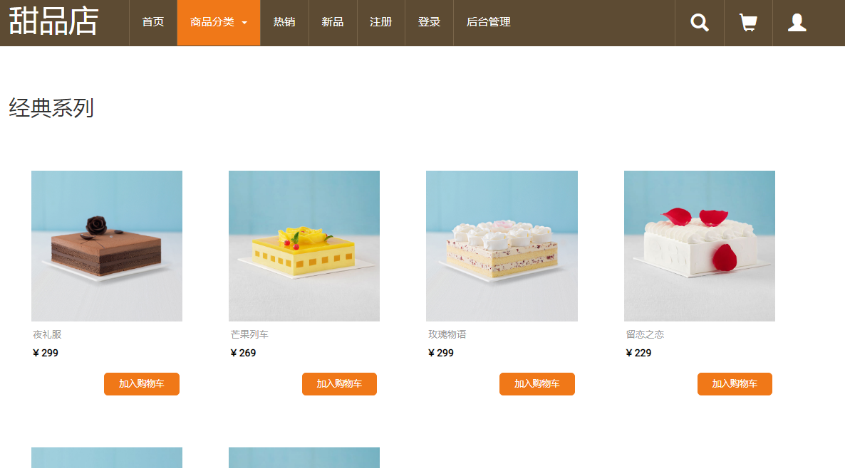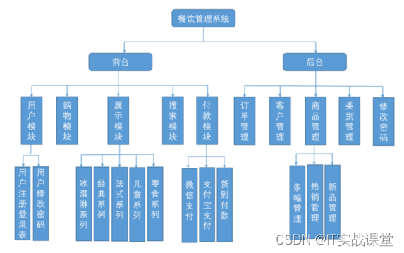 在整个餐饮管理系统中,一共分成了两大块,一个是前台展示,一个是后台管理。前台展示分成了五个部分,分别是用户模块、购物模块、展示模块,搜索模块和付款模块,用户模块分成注册和登录,展示模块分成冰淇淋系列、经典系列、法式系列、儿童系列、零食系列,付款模块分成支付宝、微信、货到付款;后台管理分成五大块,分别是订单管理、客户管理、商品管理、类别管理、修改密码,其中商品管理分成条幅管理、热销管理和新品管理。