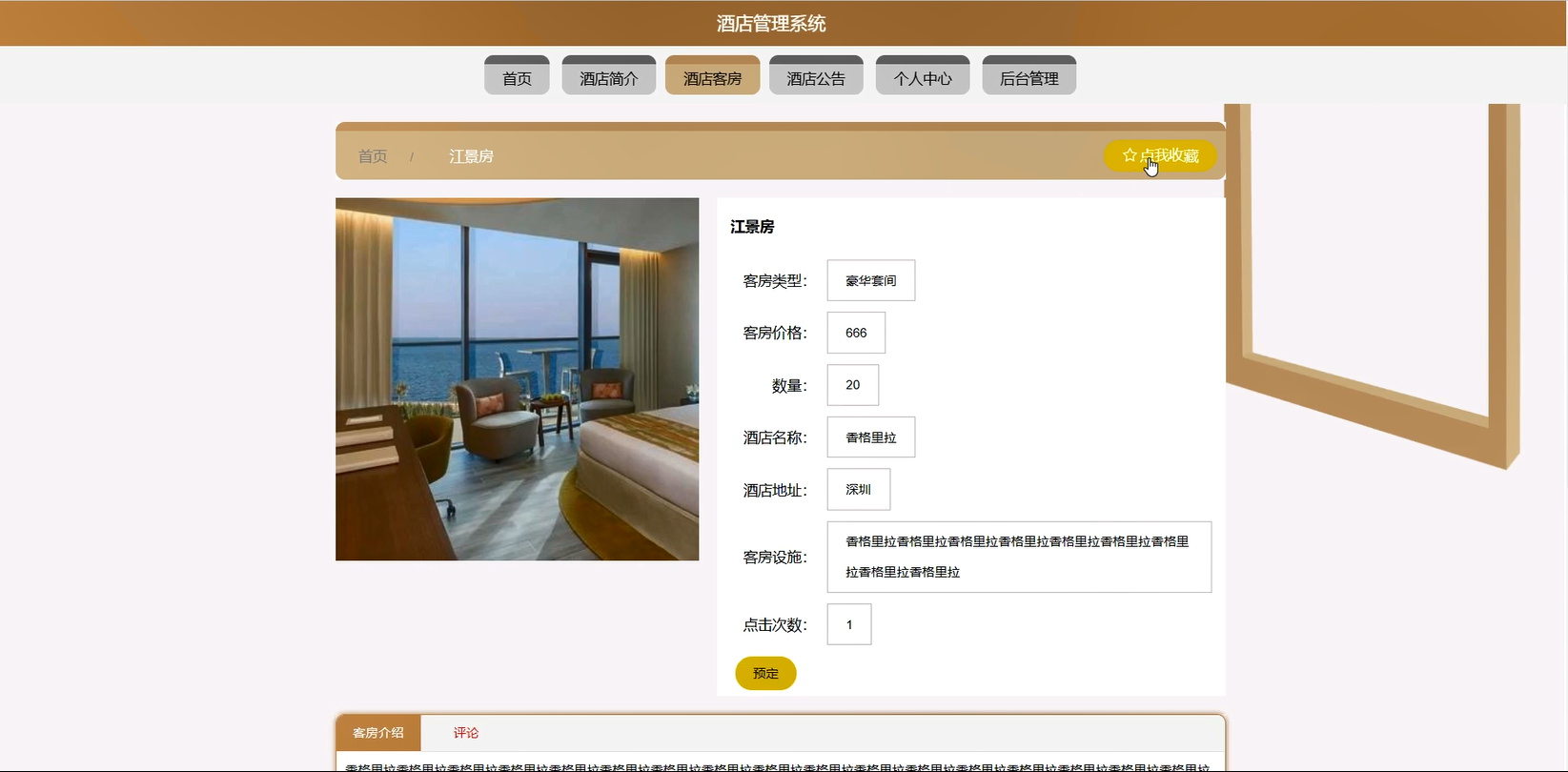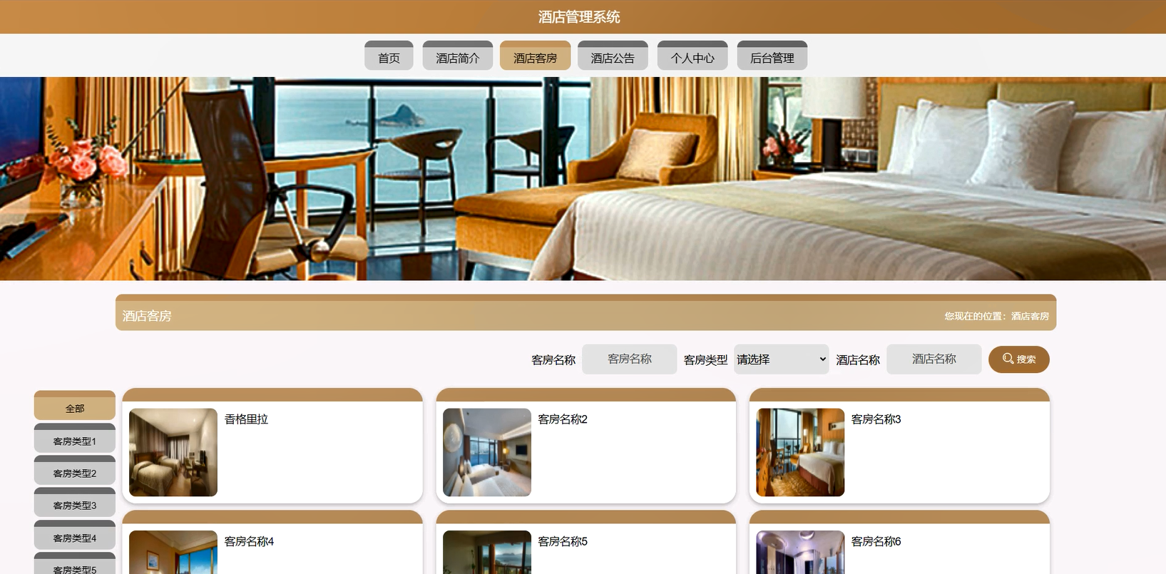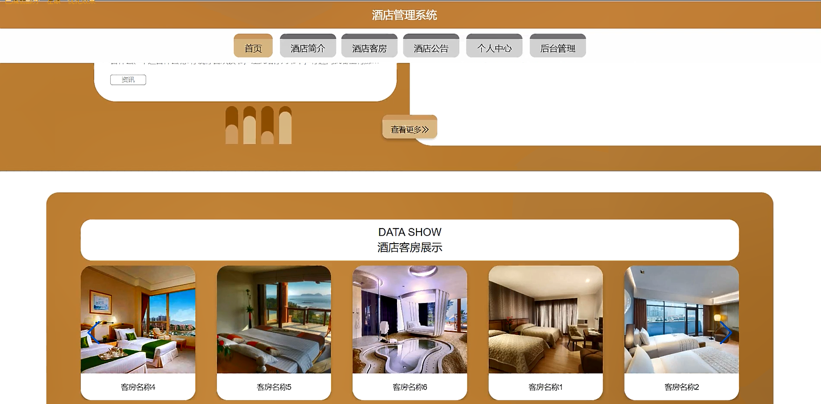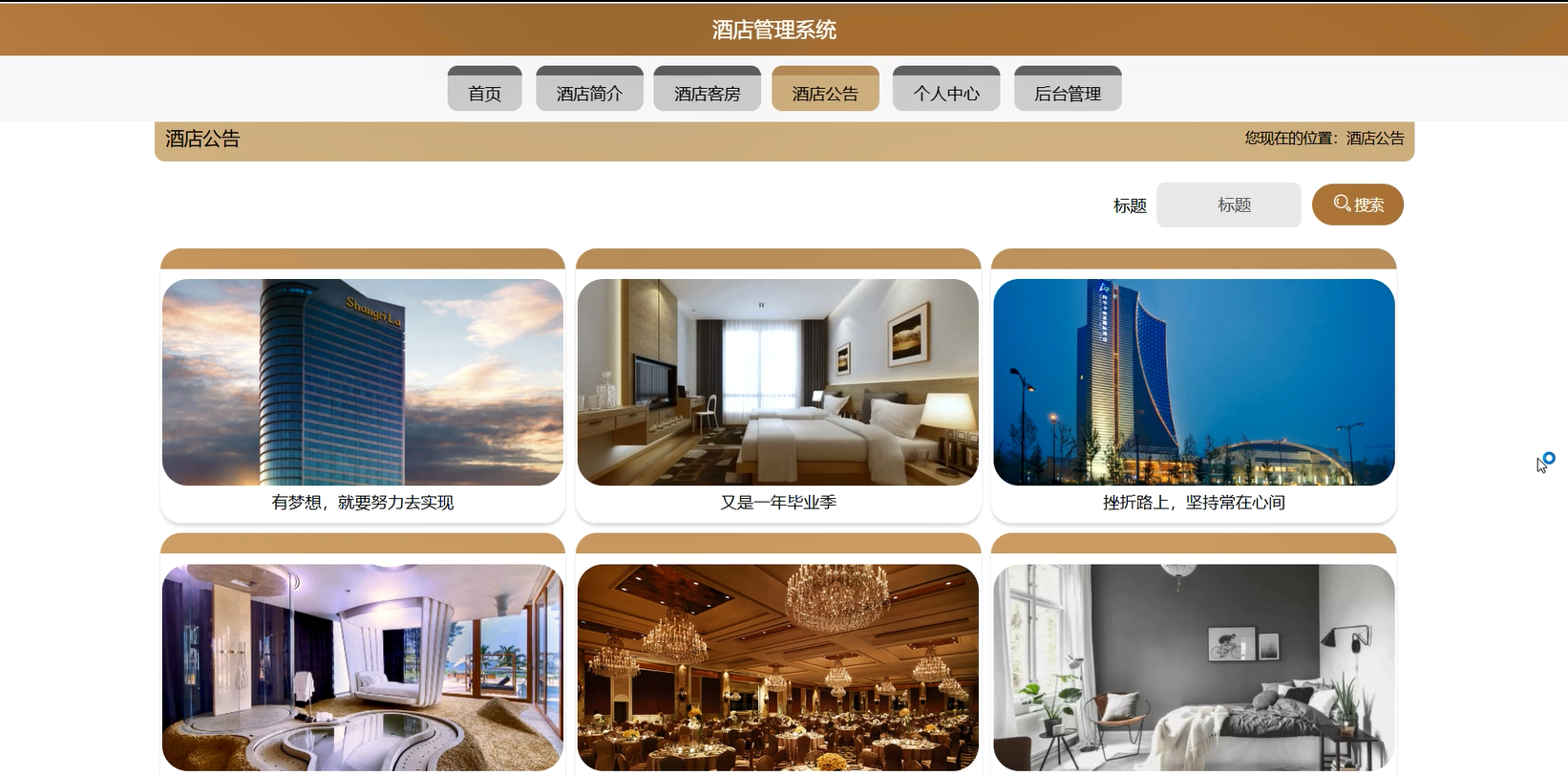 用户端功能有:前台首页、酒店客房查看预定、公告浏览、个人信息管理,登录后台可以支付客房预定费用、查看入住安排等。