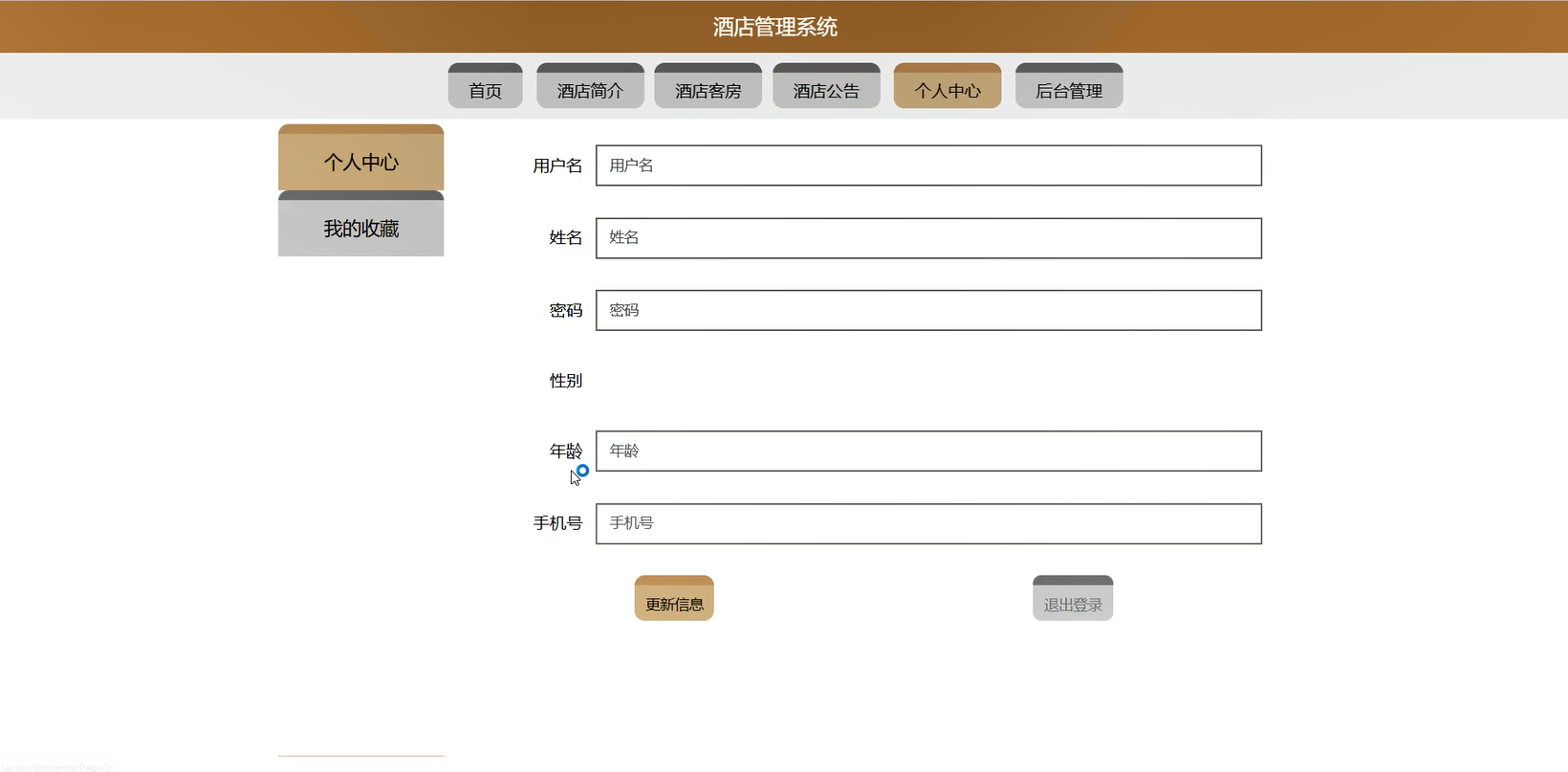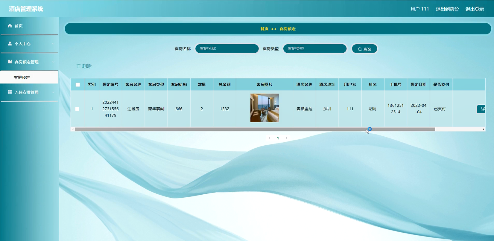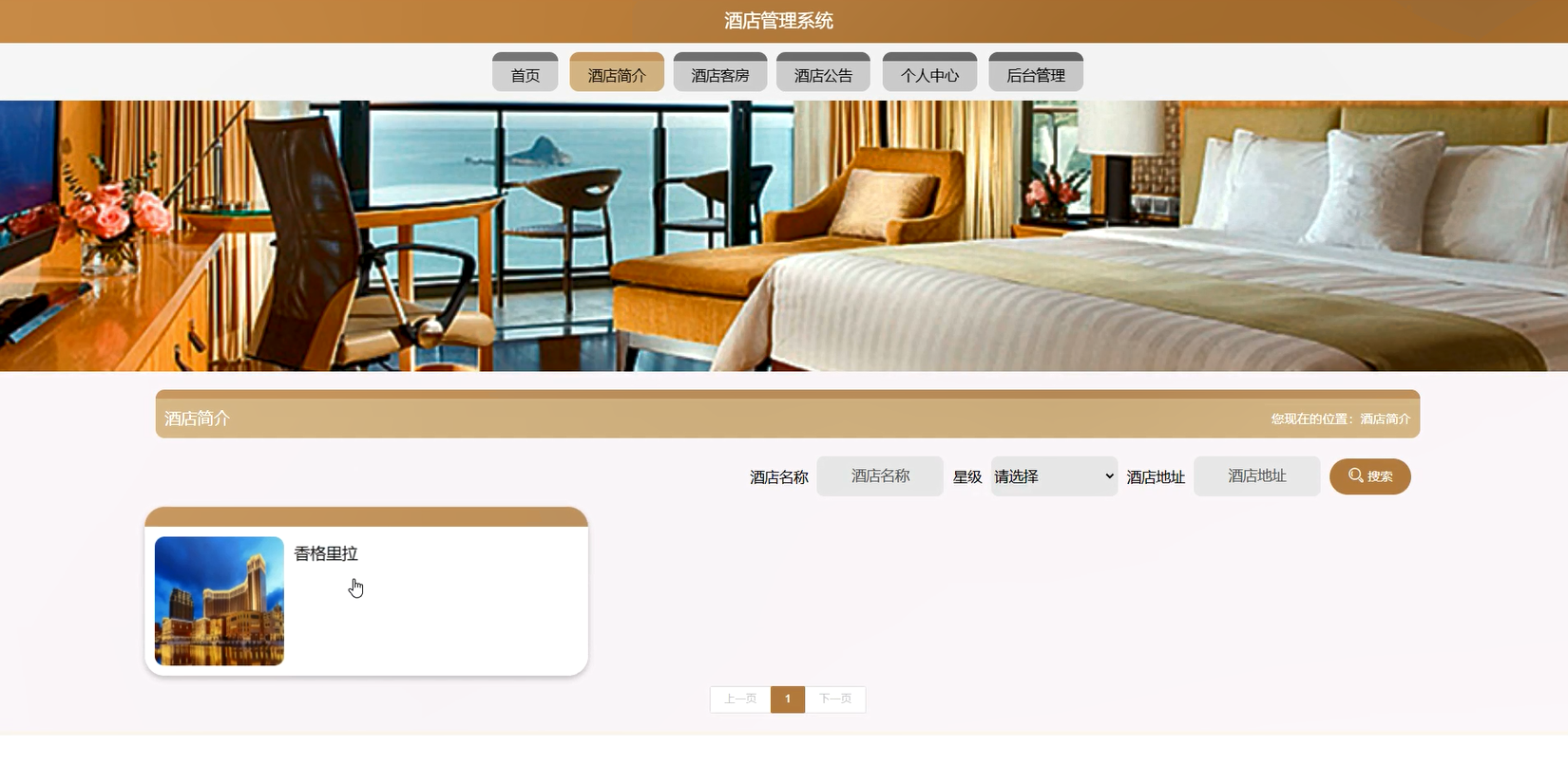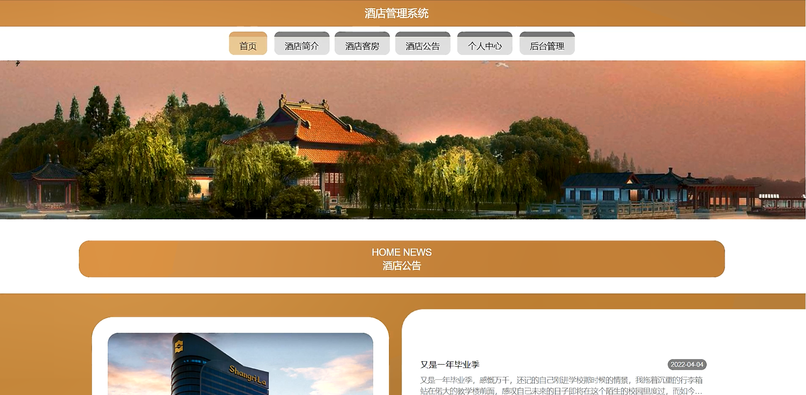 用户端功能有:前台首页、酒店客房查看预定、公告浏览、个人信息管理,登录后台可以支付客房预定费用、查看入住安排等。
