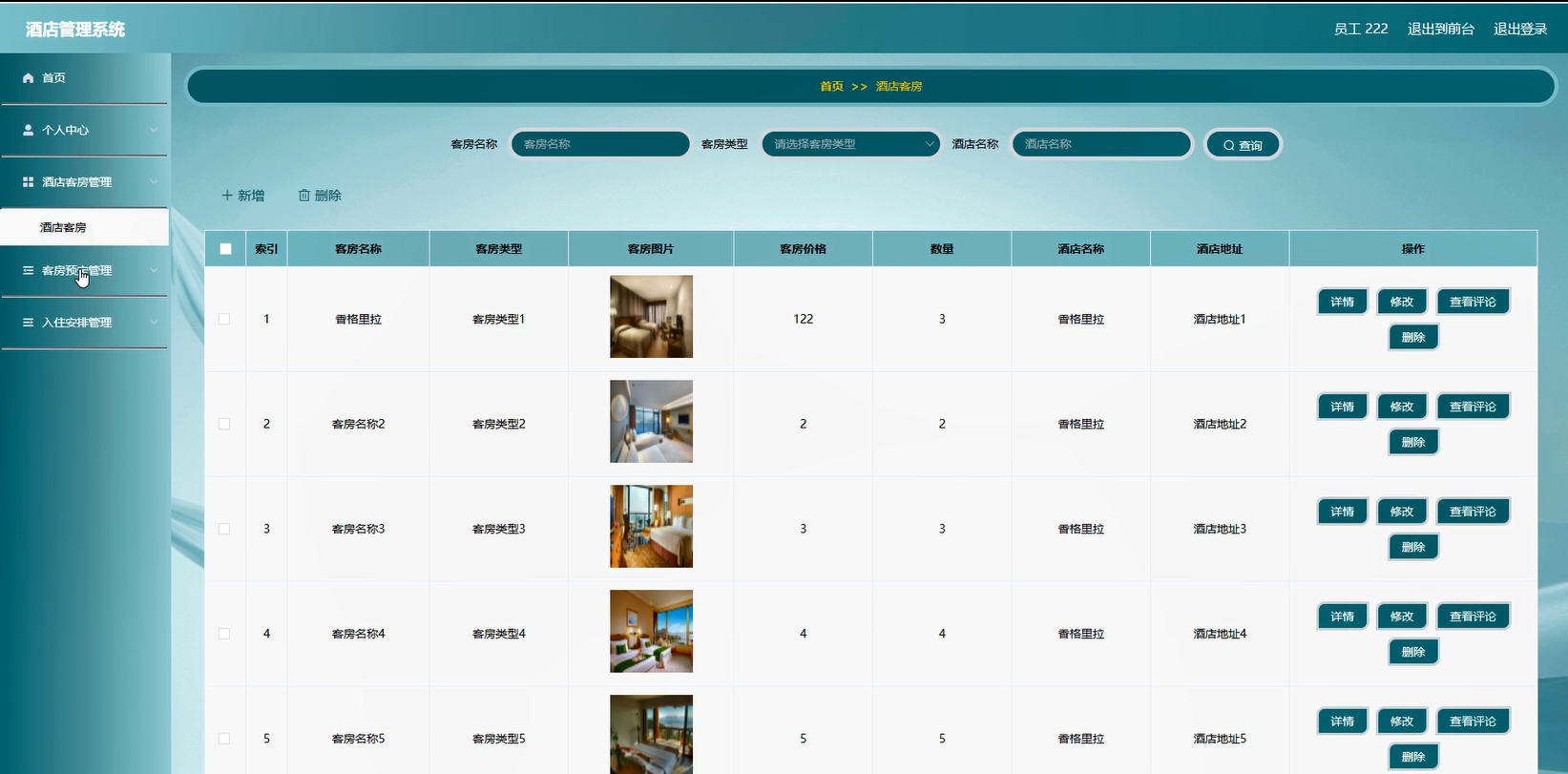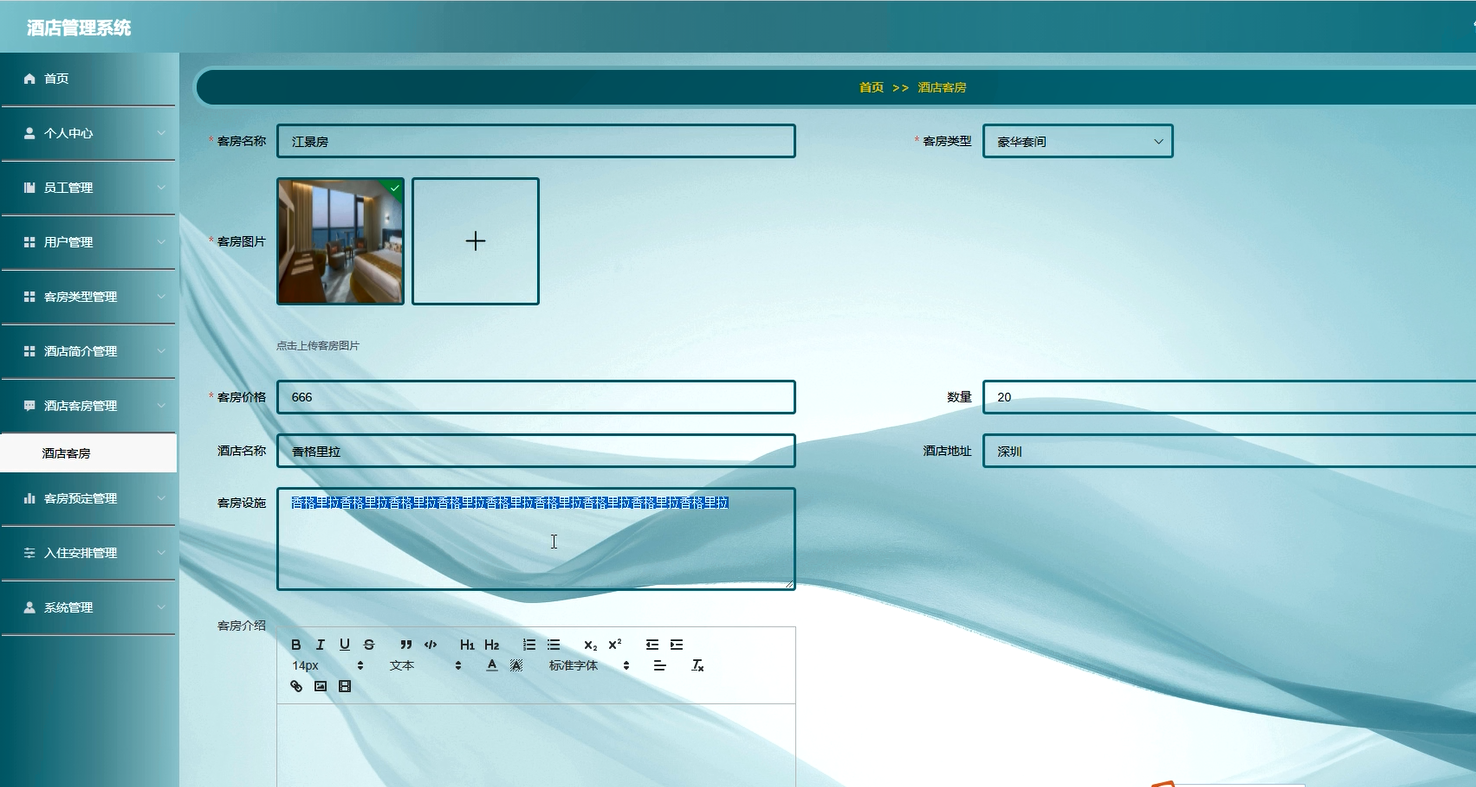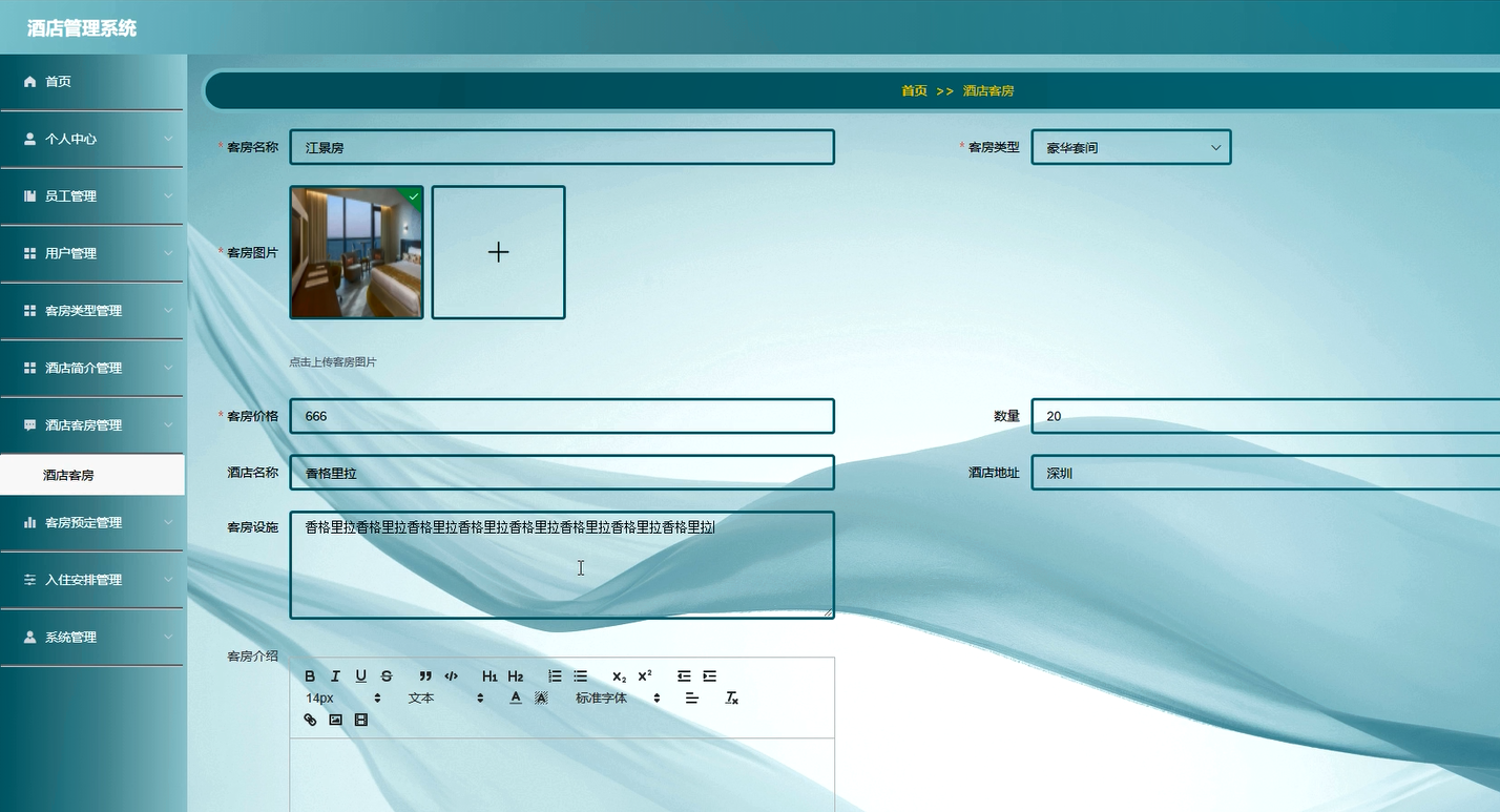 管理端功能有:员工管理、用户管理、客房类型管理、酒店简介管理、酒店客房管理、客房预定管理、入住安排管理、轮播图管理、系统管理等