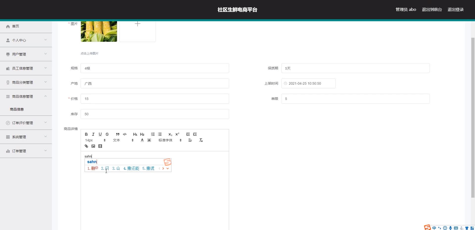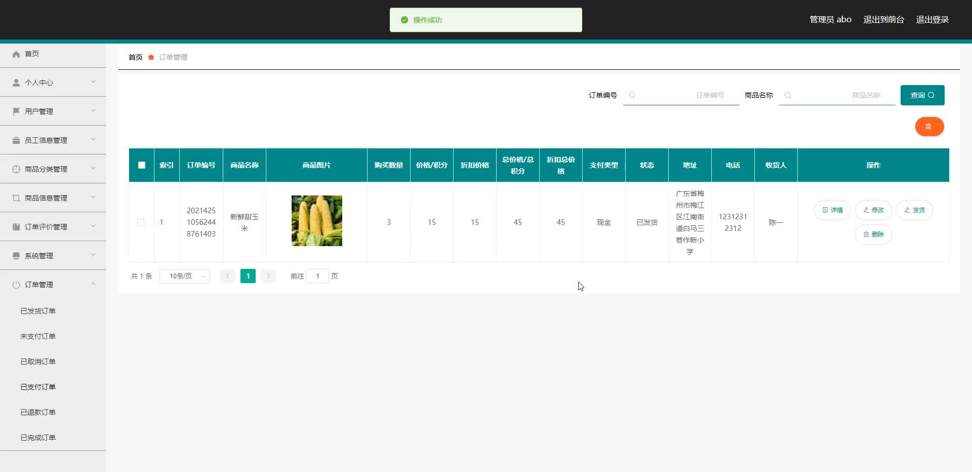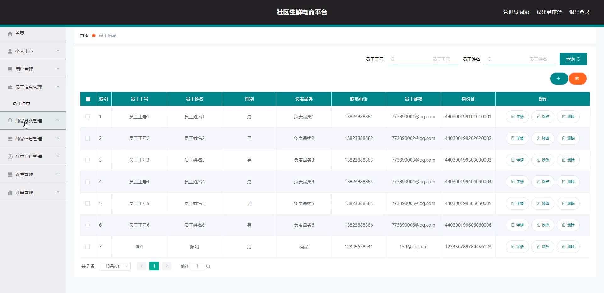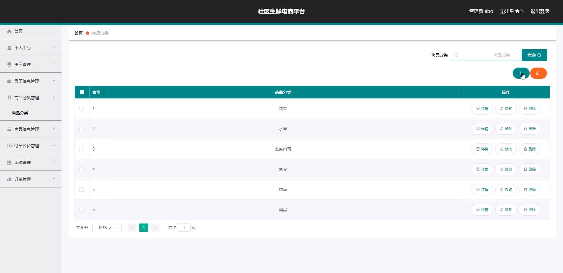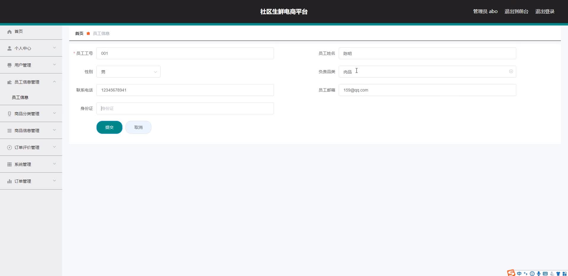 管理员功能有个人中心,用户管理,员工信息管理,商品分类管理,商品信息管理,订单评价管理,系统管理,订单管理等。