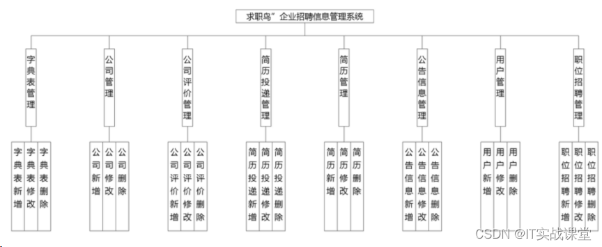 第四章:这个章节主要绘制出了系统功能架构,让我们更直观了解”求职鸟”企业招聘信息管理系统的功能,对后台数据库表进行了设计,还画出了对应的E-R图。