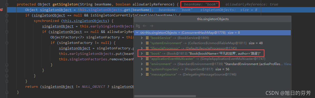 这里其实就是从DefaultSingletonBeanRegistry中的singletonObjects获取,也就是之前初始化Bean时存入的,这个时候singletonObjects中就有值了