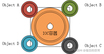 如上图所示,A、B、C、D对象之间没有耦合关系,它们的关联完全依赖于中间的IOC容器,IOC容器成了整个系统的核心。