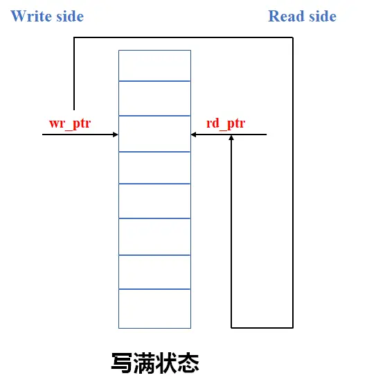 同理,当写地址指针再次追上读地址指针,FIFO便是写满状态,就像下图