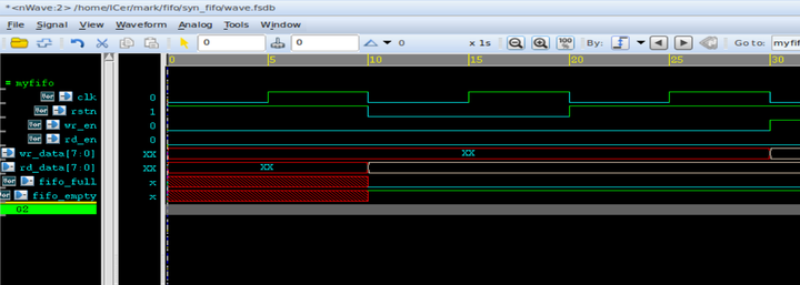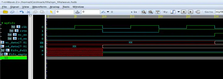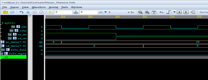 拉低wr_en,拉高rd_en开始读取数据,此处可以看出,读取数据时,先读取出两个8,随后读取一个39,随后fifo_empty被拉高,因为此时FIFO中已经没有数据可供读取Verilog中的FIFO设计-同步FIFO篇