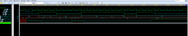 随后,我们将wr_data赋值为8,并让wr_en有效,在时钟上升沿到来时,开始写入数据,此时fifo_empty被拉低,因为有数据被写入