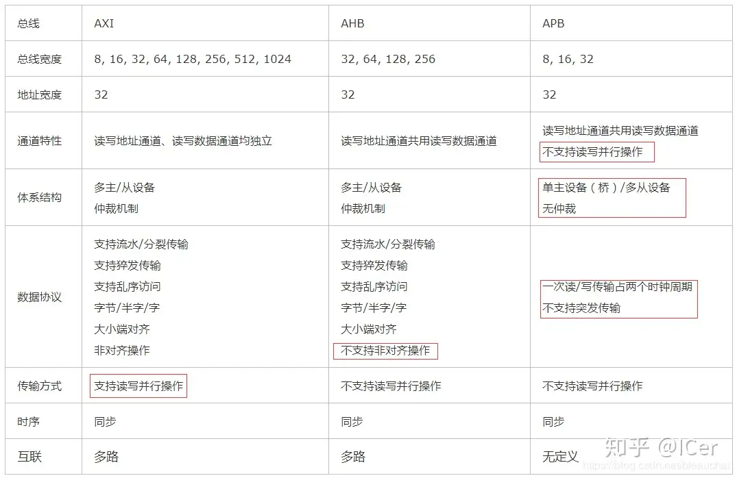 在数据操作方面,AHB和AXI支持突发传输,APB不支持;此外,AXI支持数据的非对齐操作,AHB不支持;