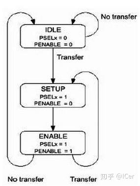 APB的协议也十分简单,甚至不是流水的操作,固定两个时钟周期完成一次读或写的操作。其特性包括:两个时钟周期传输,无需等待周期和回应信号,控制逻辑简单,只有四个控制信号。APB上的传输可用如图所示的状态图来说明: