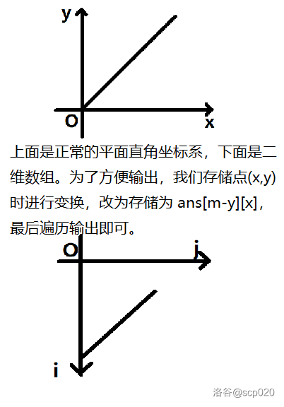 因为这道题只是让我们画出在整数点上的图像,所以我们考虑从 000 到 n−1n-1n−1 枚举横坐标,即可求出对应的纵坐标,进行记录即可。