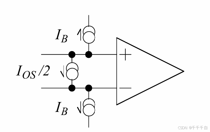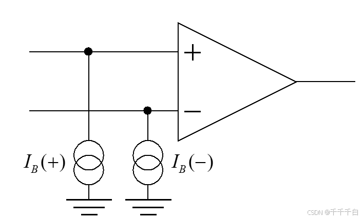 首先,我们需要知道一个概念:偏置电流。在这里我们提到的是输入偏置电流。可以看上面长尾式差分放大电路的例子,为了使两个BJT工作在放大区,基极必须提供一定的输入电流 IB(+) 与IB(-)。而对于FET构成的输入级来说,影响主要是漏电流,详细解释可以看:深度解析输入偏置电流和输入失调电流的定义来源以及对电路的影响-优快云博客。理想情况下,运放的输入端是没有电流存在的,但是为了保证放大器工作在线性区,或者需要ESD保护二极管,所以实际的运放可以视为一个理想运放与两个偏置电流源的组合: