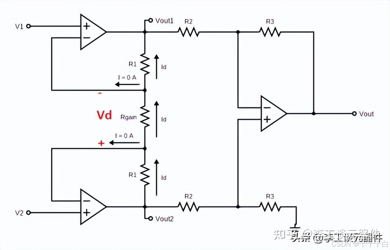 简单来说,仪表放大器就是由两个同相放大器和一个差分放大器构成的组合,对于第一级,也就是两个同相放大器的部分,假设忽略偏置电流的影响,理想情况下,,所以: