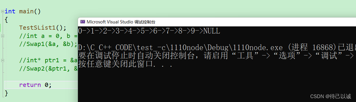 void TestSList1() { SLTNode* plist = CreateSList(10); SLTPrint(plist); } int main() { TestSList1(); //int a = 0, b = 1; //Swap1(&a, &b); //int* ptr1 = &a, *ptr2 = &b; //Swap2(&ptr1, &ptr2); return 0; }如图: