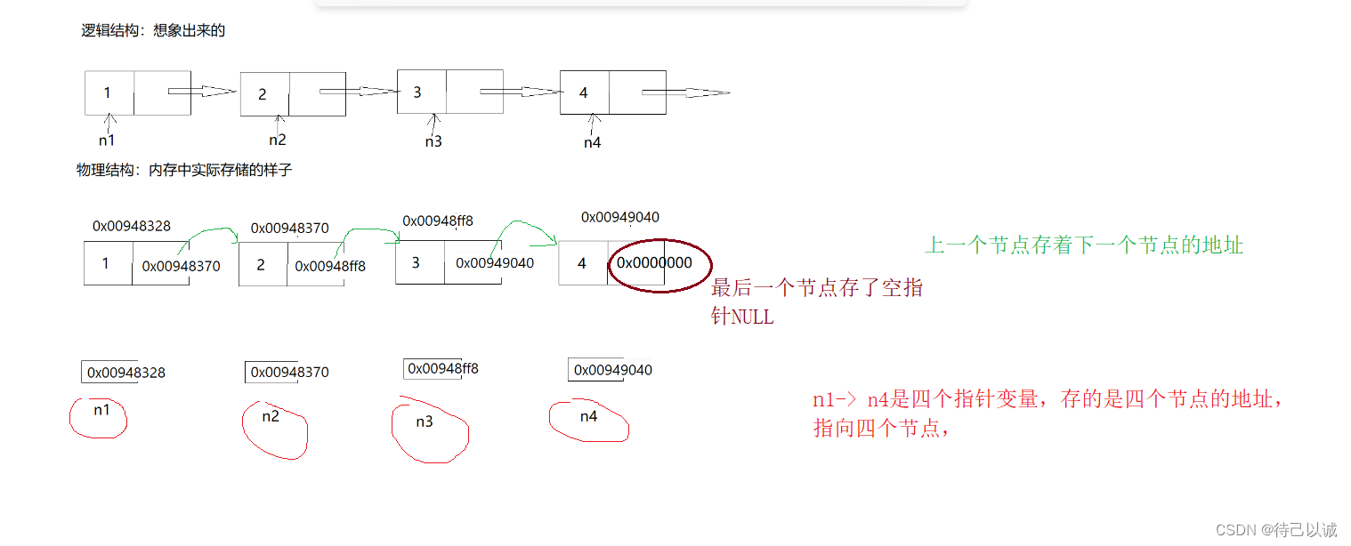 1.由上图可知,链式结构在逻辑上是连续的,但是在物理上不一定连续