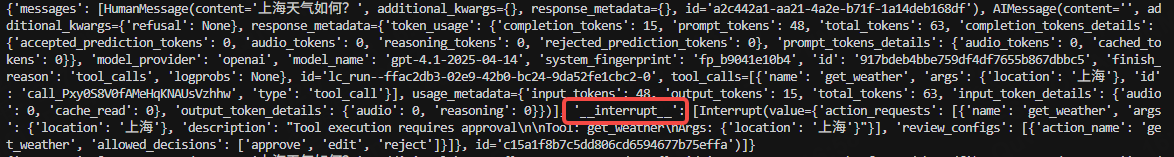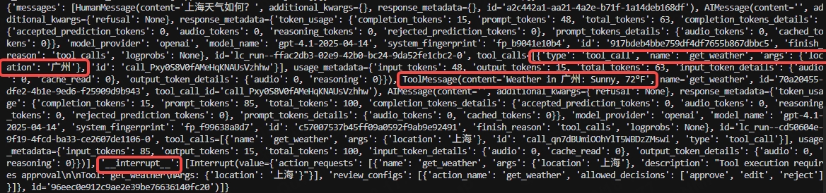 结果显示工具按照修改后参数执行了,但agent认为结果不符合,继续请求工具,并再次产生中断