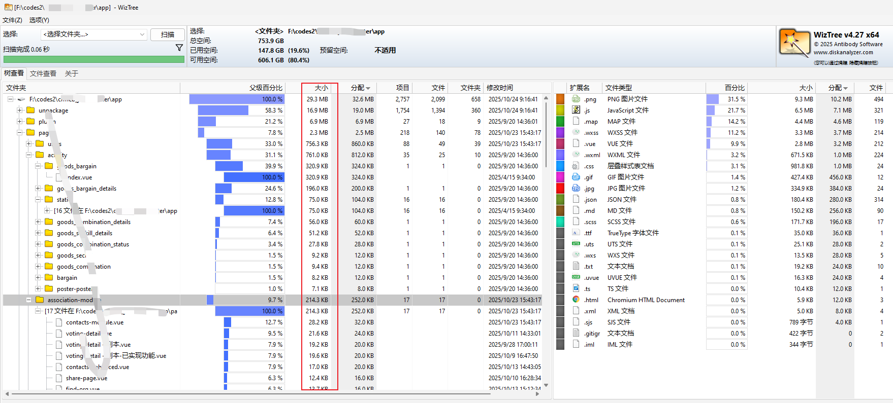 1 通过WizTree工具 查看 各个目录的文件大小情况。大致一般为图片过大。比如:static目录下的图片文件。