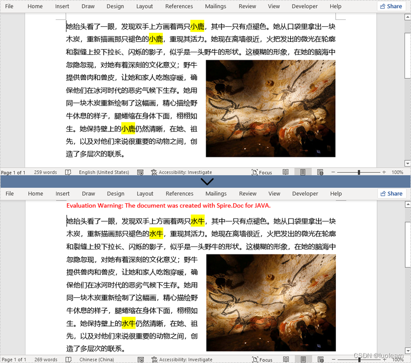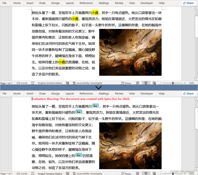 import com.spire.doc.Document; import com.spire.doc.DocumentObject; import com.spire.doc.FileFormat; import com.spire.doc.documents.TextSelection; import com.spire.doc.fields.DocPicture; import com.spire.doc.fields.TextRange; public class replaceTextWithImage { public static void main(String[] args) { //创建 Document 类的对象 Document document = new Document(); //载入Word文档 document.loadFromFile("洞穴艺术.docx"); //查找文档中与“小鹿”匹配的所有匹配项 TextSelection[] selections = document.findAllString("小鹿", true, true); //循环遍历所有匹配项,替换为载入的图片 int index = 0; TextRange range = null; for (Object obj : selections) { TextSelection textSelection = (TextSelection)obj; //创建 DocPicture 类的对象并载入图片 DocPicture pic = new DocPicture(document); pic.loadImage("小鹿.png"); range = textSelection.getAsOneRange(); index = range.getOwnerParagraph().getChildObjects().indexOf(range); range.getOwnerParagraph().getChildObjects().insert(index,pic); range.getOwnerParagraph().getChildObjects().remove(range); } //将指定的匹配项替换为图片 //创建 DocPicture 类的对象并载入图片 //DocPicture pic = new DocPicture(document); //pic.loadImage("C:/Users/Allen/Desktop/deer.png"); //Object object = selections[1]; //TextSelection selection = (TextSelection) object; //TextRange textRange = selection.getAsOneRange(); //int i = textRange.getOwnerParagraph().getChildObjects().indexOf(textRange); //textRange.getOwnerParagraph().getChildObjects().insert(i,pic); //textRange.getOwnerParagraph().getChildObjects().remove(textRange); //保存结果文档 document.saveToFile("查找并替换文本为图片.docx", FileFormat.Docx_2013); } }