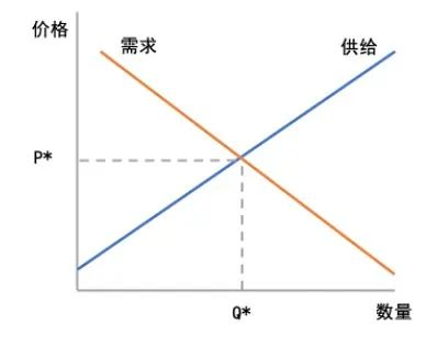 经济学中常用供需曲线来决定市场的均衡价格和均衡产量。这个模型适用于竞争性市场,而不适用于市场存在垄断或者寡头垄断的情况。在这个供需曲线图里,需求曲线反应了是随着价格的升高,消费者减少购买的趋势(橙色线的斜率);供给曲线反应了随着价格的升高,生产者增加生产的趋势(蓝色线的斜率)。