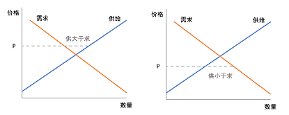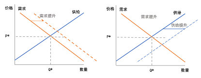 在价格不变的情况下,市场的需求如果提升,会如上图出现供不应求的情况。如果通过某种手段提升了供给,而价格依然不变,则会出现供大于求的情况。