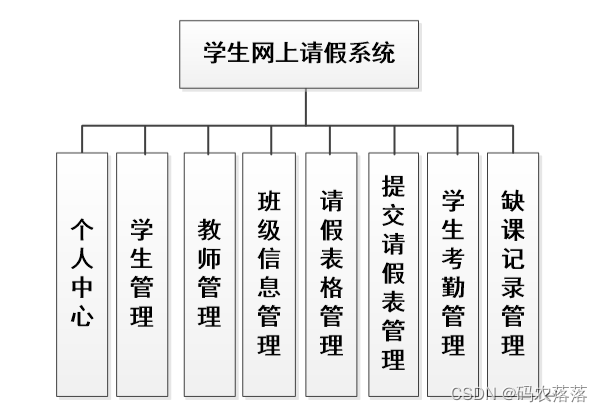 学生网上请假系统的主要使用者管理员功能有个人中心,学生管理,教师管理,班级信息管理,请假表格管理,提交请假表管理,学生考勤管理,缺课记录管理。教师功能有个人中心,学生管理,班级信息管理,请假表格管理,提交请假表管理,学生考勤管理,缺课记录管理。学生功能有班级信息管理,请假表格管理,提交请假管理,学生考勤管理,缺课记录管理。
