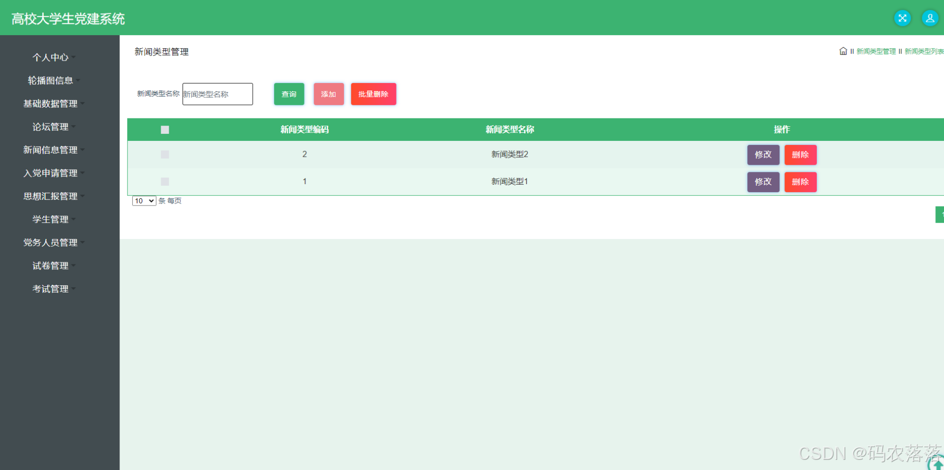此页面提供给管理员的功能有:新增新闻类型,修改新闻类型,删除新闻类型。