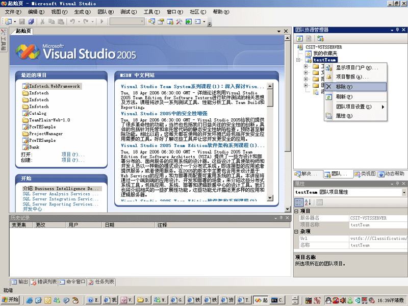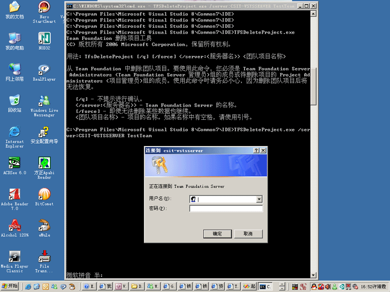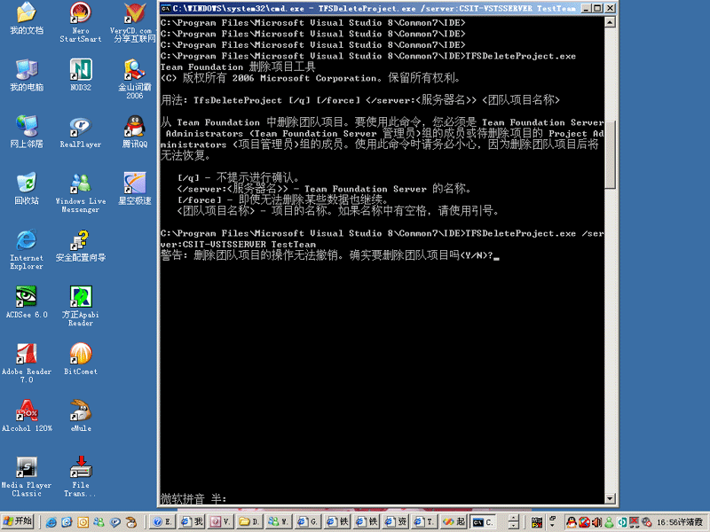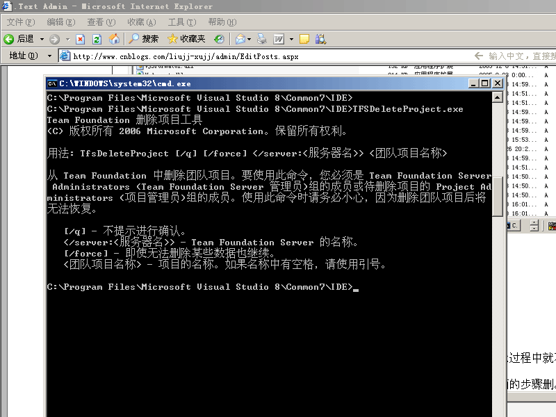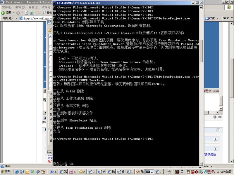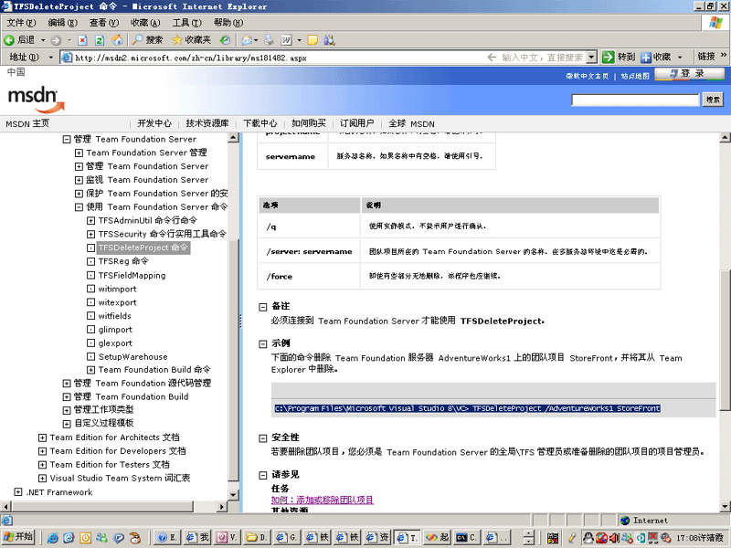 因为VSTS的资料比较少,很多内部设置和描述不能得到微软的正式认可,因此在以后的介绍中要做大量的试验来验证我的一些想法和认识。这就会有很多的试验团队项目,为了减轻服务器压力,就只好建几个试验的项目就删几个。有些朋友可能对删除团队项目找不到地方,VS2005的TeamExplor的IDE环境中只提供了移除的功能。![]() 这里就补充一节介绍团队项目的硬删除。以后这个命令会常用到。 可能是出于安全的考虑,微软未在VS2005的TeamExplor的IDE环境中提供物理删掉整个团队项目的功能。 但是并不意味着不能删除。实际还是提供了一个命令工具的,那就是C:/Program Files/Microsoft Visual Studio 8/Common7/IDE目录下的TFSDeleteProject命令。 ![]() 进入DOS命令。开始-运行-cmd 进入 C:/Program Files/Microsoft Visual Studio 8/Common7/IDE目录。 在这个目录下有个 TFSDeleteProjec.exe执行文件。 ![]() 此命令有几个参数 1、/q 是可选参数。如果写了/q 如 TFSDeleteProjec.exe /q ......那么在后面的删除过程中就不再提问。如果没写 /q那么就会一步步提问。其实提问的也不多。保险起见还是不写/q。 2、/force 是可选参数。指强制运行,就是遇到有删除不了的部分还要继续下面的步骤删。 3、/server:<TFSservername> 是必写参数。写上你的VSTS服务器的名字。 4、projectname 是必写参数。写上你要删除的项目的名字。 比如我的服务器是 CSIT-VSTSSERVER 并且已经建立了一个TestTeam团队项目如下所示: ![]() 现在我要删除它。 就录入 TFSDeleteProject.exe /server:CSIT-VSTSSERVER TestTeam 如下图所示: ![]() 回车后。开始运行。如果你是在自己的机器上操作的。不是在TFS服务器上用TFS管理员登陆进行操作的。就会出现登陆对话框。如下图: ![]() 输入Team Foundation Server 的全局/TFS 管理员或准备删除的团队项目的项目管理员。登陆到服务器上。 就会提问是否要删除团队项目。看来是微软是很怕用户误删除。如下图所示 ![]() 输入 Y。删除就一步步进行了。最后删除完毕。过程如下图所示: ![]() 微软英文的MSDN中给的例子输入的命令是错误的。如下图: ![]() 少了 /server: 参数 正确的应该是 C:/Program Files/Microsoft Visual Studio 8/Common7/IDE/TFSDeleteProject /server:Adverturework1 storeFront。 可能是微软在测试开发阶段用VC写的测试版的命令没加 /server:。后来发现如果省了这个标志,参数不好判断是服务器名还是项目名所以正式发行的时候又加上了 /server:。纯属个人猜测。 掌握了团队项目的硬删除了吗?那么在以后的学习中将做大量的项目创建的试验,我们就不用担心太多的垃圾项目了 |