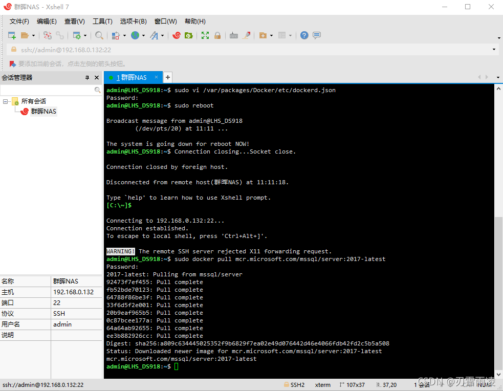 要进入命令行下操作,我们首先要打开SSH,然后利用SSH客户端工具进入控制台,我使用的是XShell。进入终端界面后,输入命令:sudo docker pull mcr.microsoft.com/mssql/server 这是安装最新版本,也是server:2019-latest。可以根据自己的需求安装对应的版本,