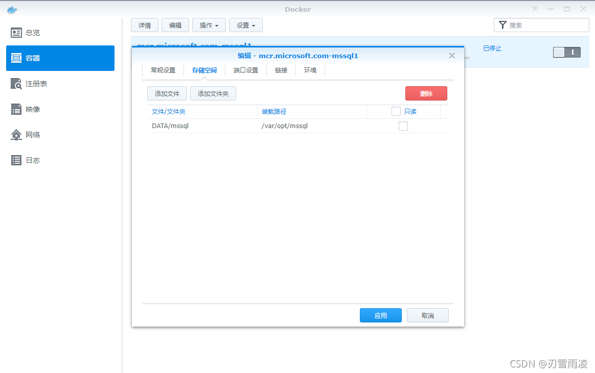 然后在存储空间页面进行添加文件夹,文件夹大家可以提前去群晖控制面板中添加文件夹,我放在DATA/mssql目录下,至于挂载路径,直接填写/var/opt/mssql。