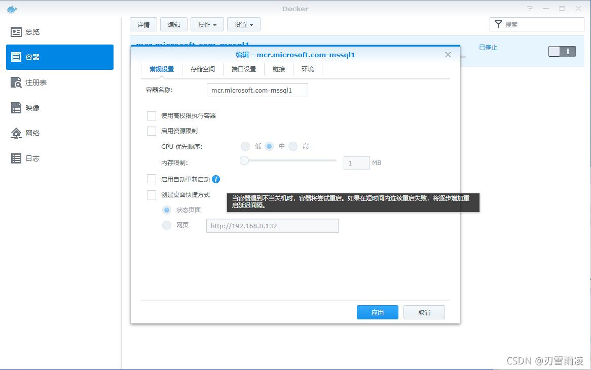 双击这个映像,会弹出创建容器界面,我们要给容器取一个名字,然后点击高级设置,在常规页面勾选“启用自动重新启动”,因为这样,重启系统后,不用手动开启mssql服务。