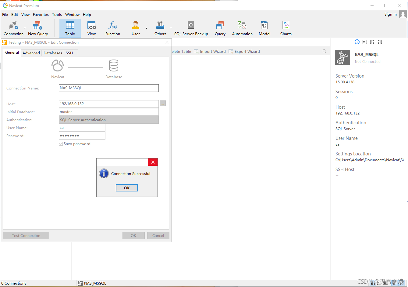 接下来就可以用MSSQL管理工具进行连接测试了,这里我用了Navicat Premium连接