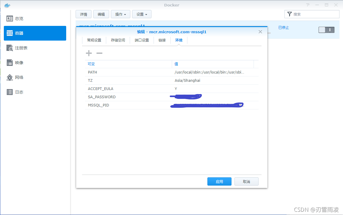 点击应用,我们就配置好了,在容器页面可以看到我们配置的mssql,点击右侧开关,就可以开启MSSQL服务
