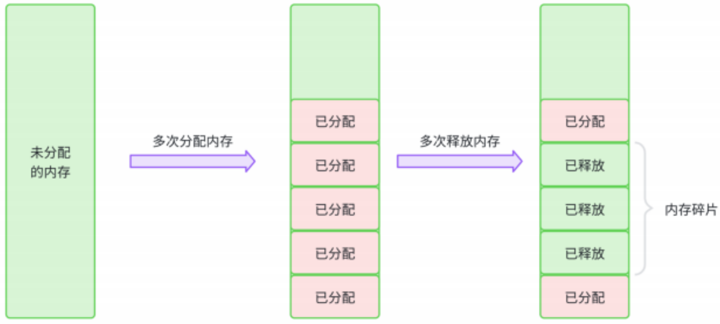 • 长期运行后碎片化严重,无法分配连续大内存。