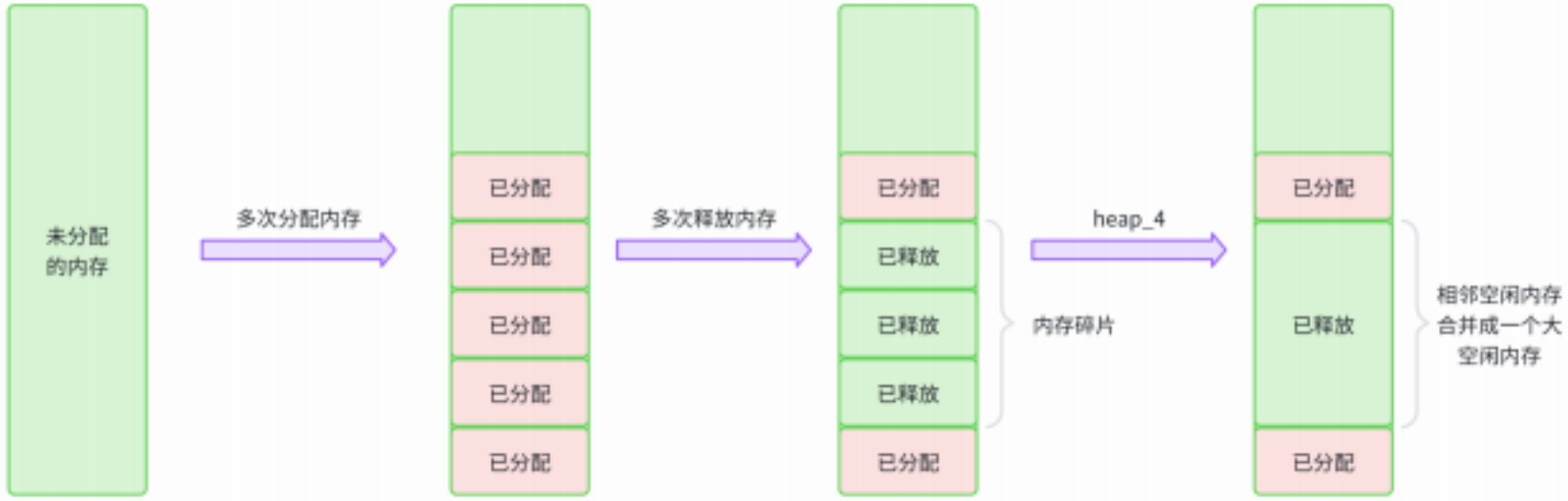 • heap_4采用首次适应算法(First Fit)和空闲块合并机制。分配时从链表头部查找第一个足够大的块,释放时检查相邻块是否空闲并合并,显著减少碎片。