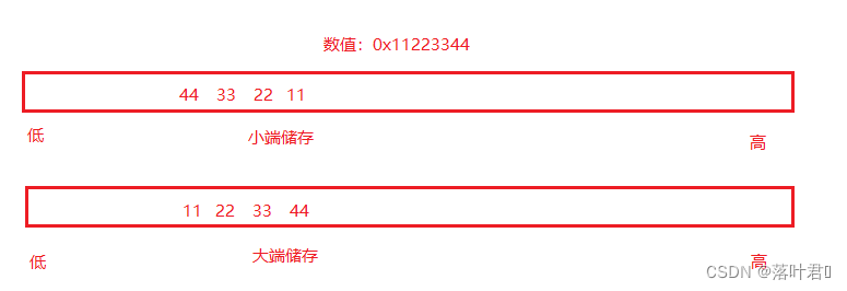 大端储存模式下,数据的低位保存在内存的高地址中,数据的高位保存在内存的低地址中;